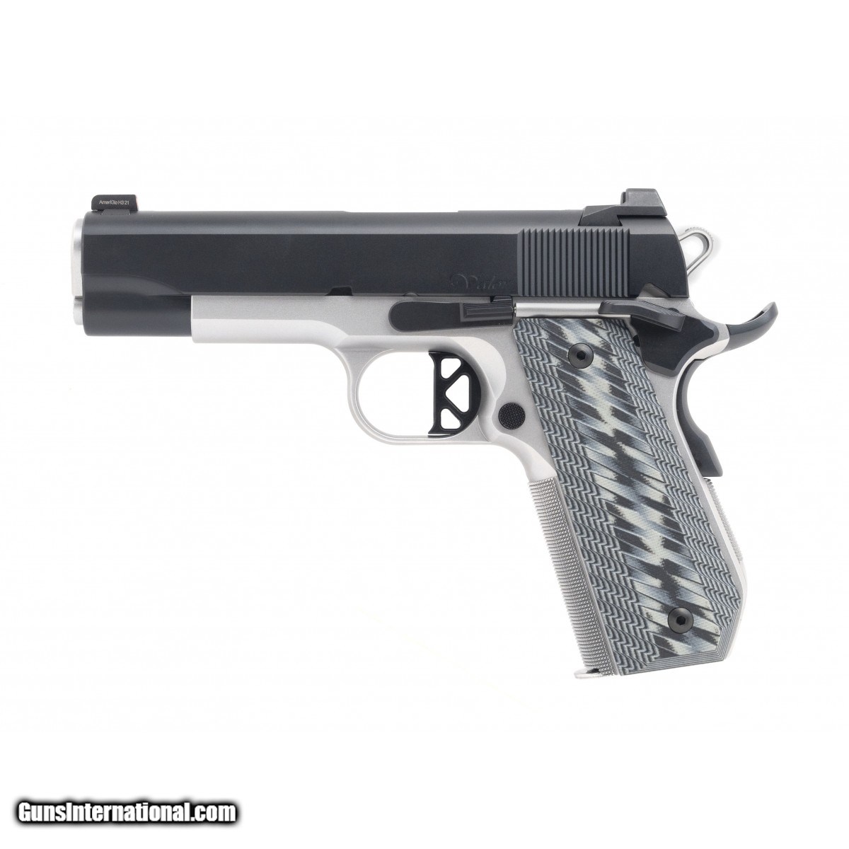 Two-toned blue slide, and stainless steel frame. 4.25"" barrel with commander sized grip. Tritium orange night sights. Ambidextrous safety with extended beavertail. Excellent front and backstrap checkering with G10 slim grey/black grips. New. UPC:806703018256