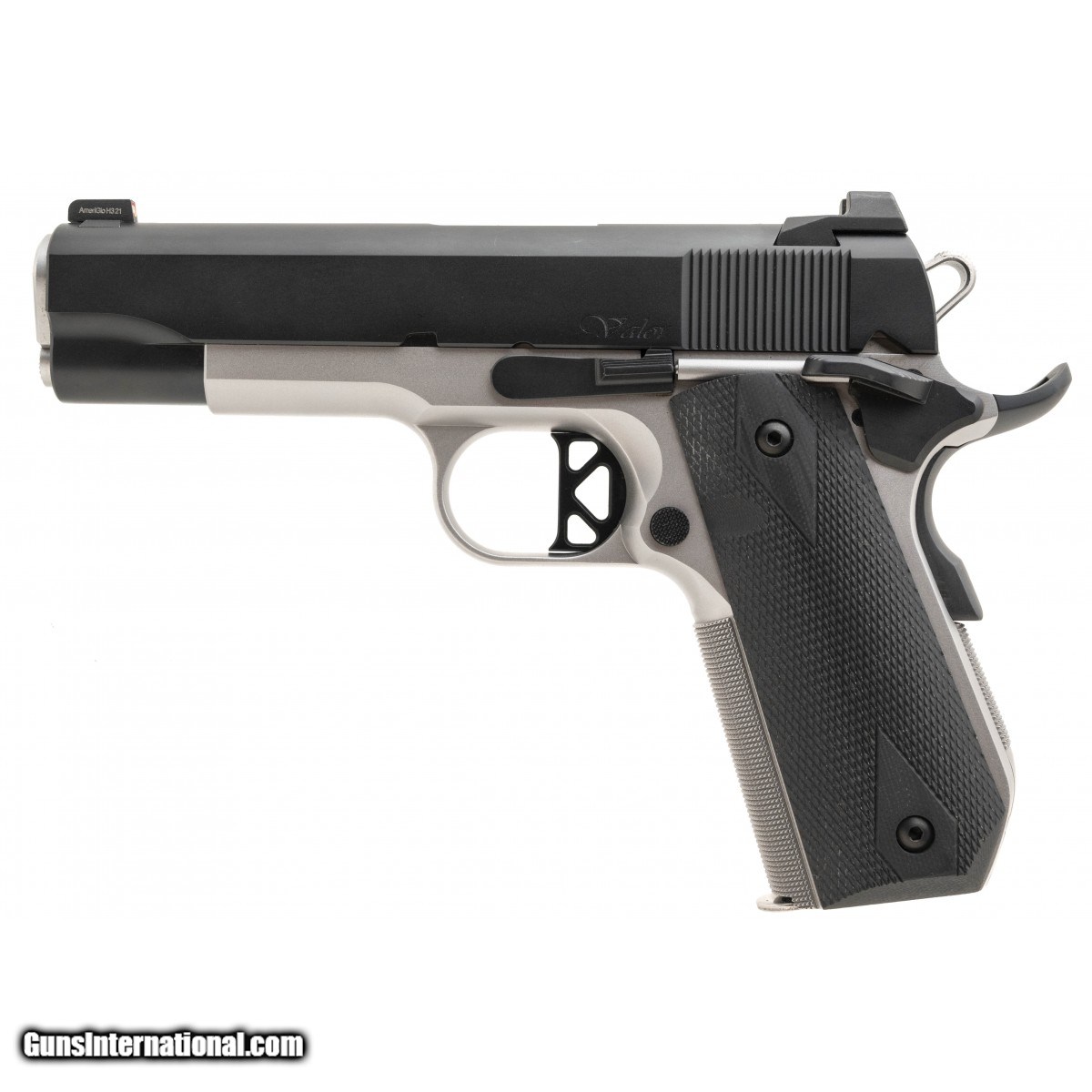 Two toned V-Bob version 1911 with bobbed frame, front night sight, ambidextrous thumb safety and match barrel. In excellent condition. Comes with box and 1 extra magazine.