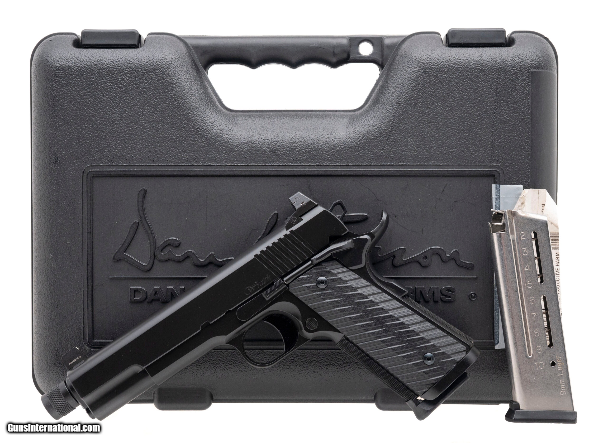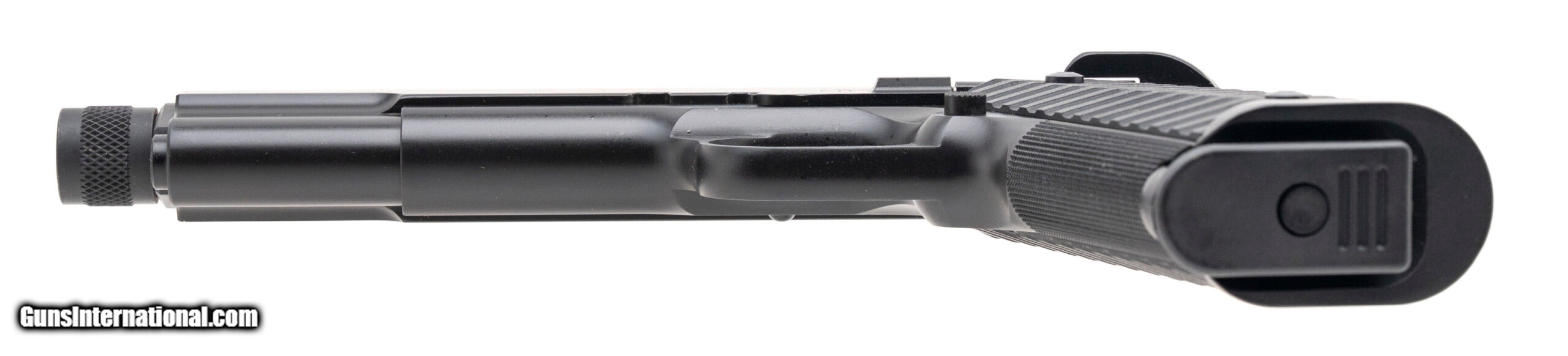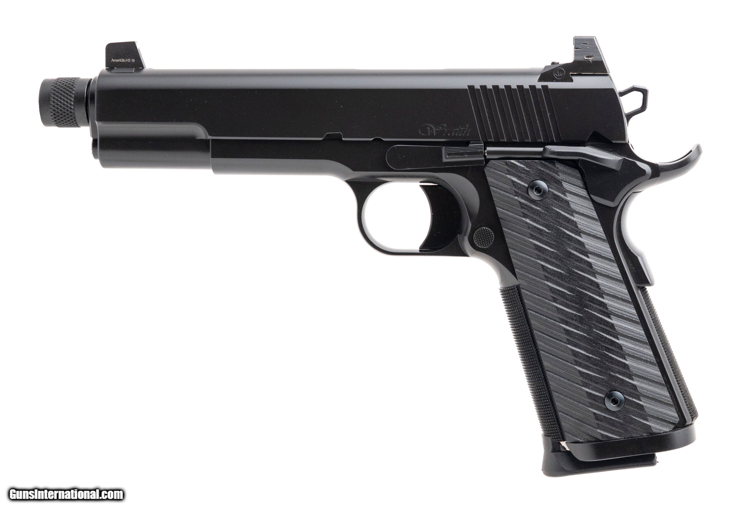 Description: "SN: 2001854. Modern production, 9mm with a 5"" threaded barrel. Bore is bright with strong rifling. Government size 1911 style pistol with suppressor height night sights and G10 grips. Excellent overall condition. Comes with case and extra magazine. SOLD |