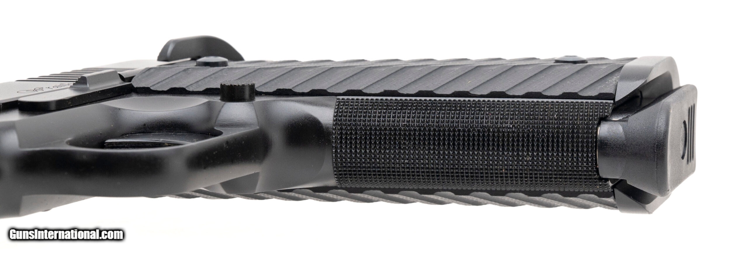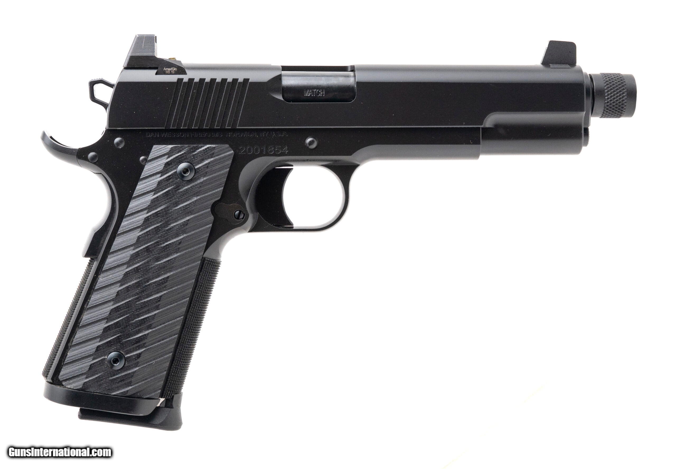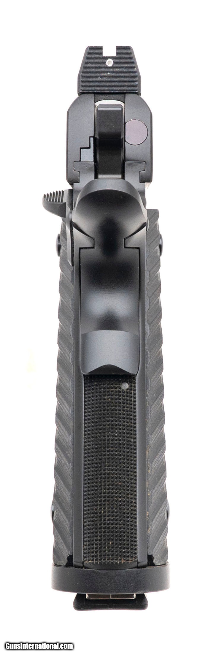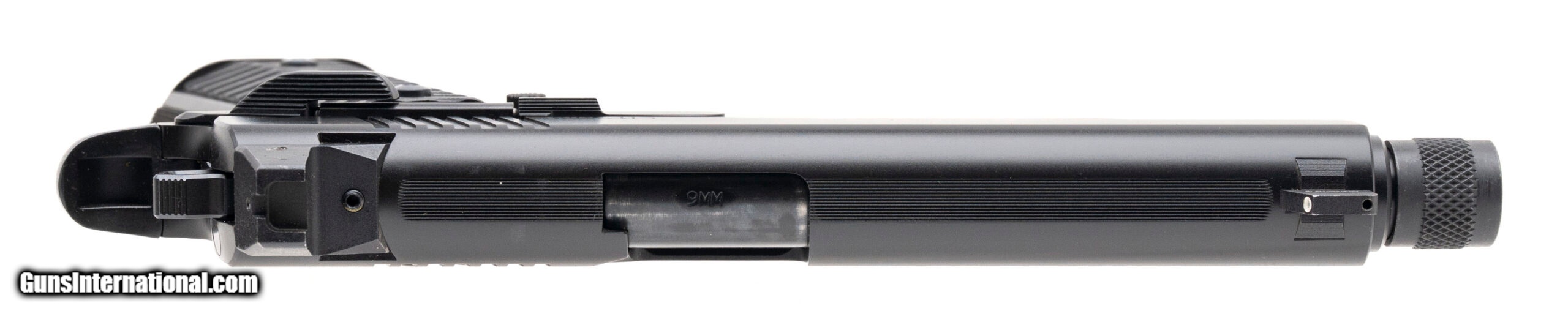 Description: "SN: 2001854. Modern production, 9mm with a 5"" threaded barrel. Bore is bright with strong rifling. Government size 1911 style pistol with suppressor height night sights and G10 grips. Excellent overall condition. Comes with case and extra magazine. SOLD |