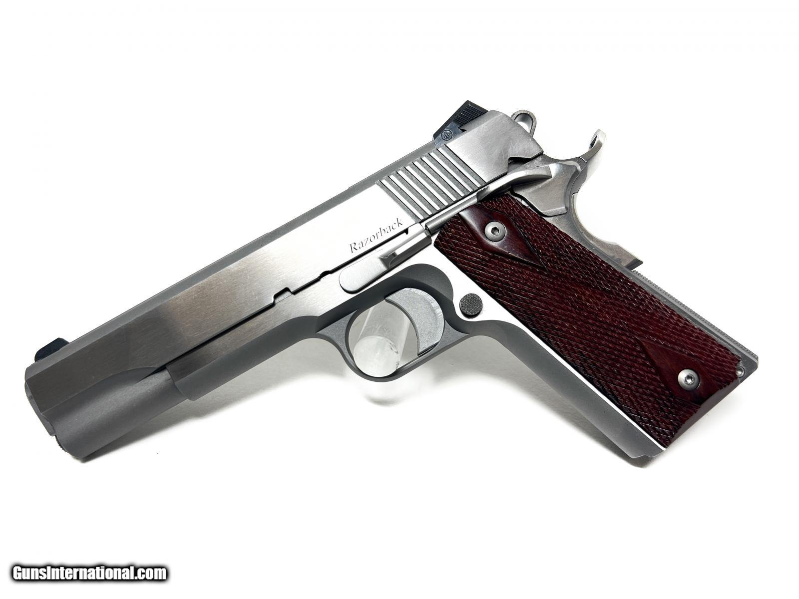 Description: Guns Listing ID: 681647 Dan Wesson Razorback 1911 10mm, 5\" Barrel, Stainless Steel Finish, Tactical Fixed Sights, Wood Grips, 8 Round, No Magazine Features the serrated Clark style target rib machined on the top of the slide with fixed defensive sights. Fit a match-grade ramped barrel. Slide is mated to our standard forged frame with undercut trigger guard and smooth front strap. Both the frame and the slide are polished to a soft brushed finish and sandblast the rounds. Double diamond cocobolo grips. Manual thumb safety/grip safety. SOLD Manufacturer: CZ Model: 01907 Caliber Info: 10MM Condition: Used - Non-Certified Barrels: 5 BARREL |