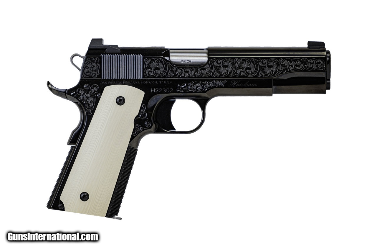 Description: Manufacturer: CZ / Dan Wesson Firearms Model: 2023 Heirloom 1911 SKU: 01938 Action: Semi-Auto Caliber: .38 Super Capacity: 9 Rounds Barrel Length: 5" Overall Length: 8.75" Trigger Mech: Single Action Frame: Steel, 70 Series, Decorative Scrollwork and Engraved with "Heirloom" Finish: High Polish Black DLC Slide: Black High-Polished, Decorative Scrollwork Grips: Ivory Colored G10 Sights: Brass Bead - Front, U-Notch Rear Safety: Manual Thumb Safety, Grip Safety Weight: 40 oz All items are factory new in box unless otherwise stated. Based on the information available to us, the above specifications describe this item to the best of our knowledge. For further information, please contact or visit the manufacturer's . SOLD |