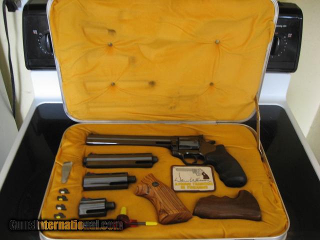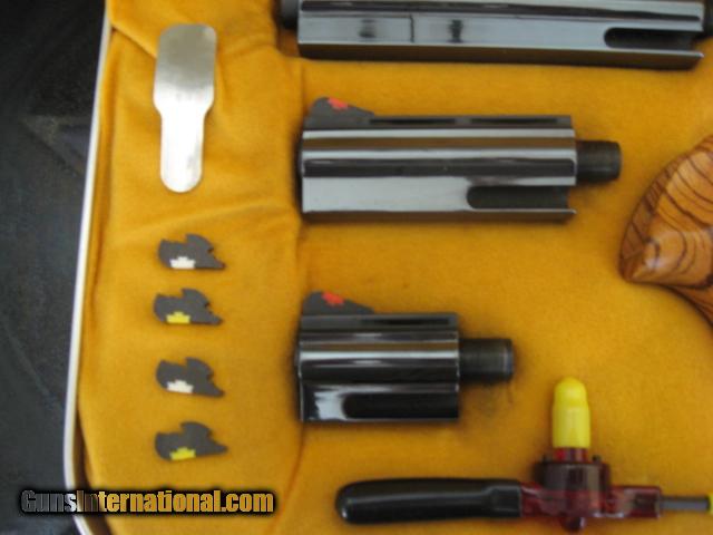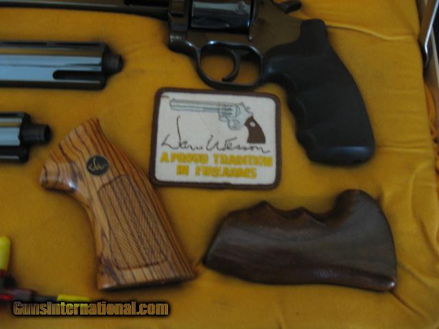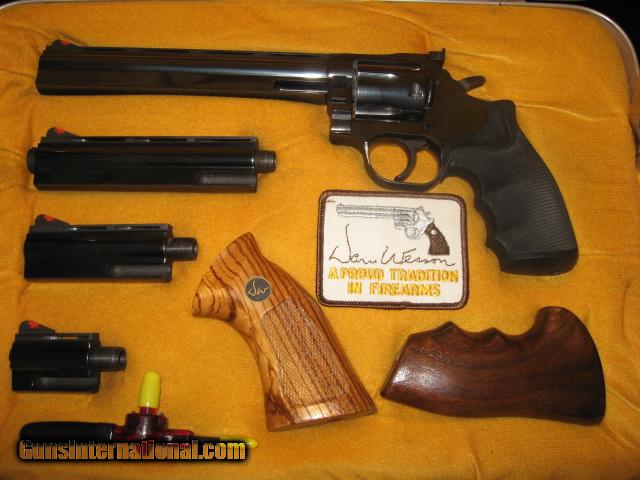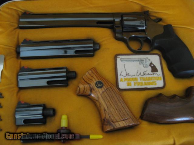 Dan Wesson Pistol Pac .357 Mag includes four vent ribbed barrels 21/2in.-4in.-6in.-8in.-Three grips-two are wood one is rubber.a wrench and spacer gauge for changing barrels also included is four extra sights and a extra wrench.Also included is a official revolver instruction manual and two 1991-1993 catalogs one showing all Dan Wesson revolvers and a catalog that shows parts for their revolvers.Manufactured in Monson,Mass. Condition of this pistol pac is excellent. $1500.00 plus $35 shipping includes insurance.Make an Offer