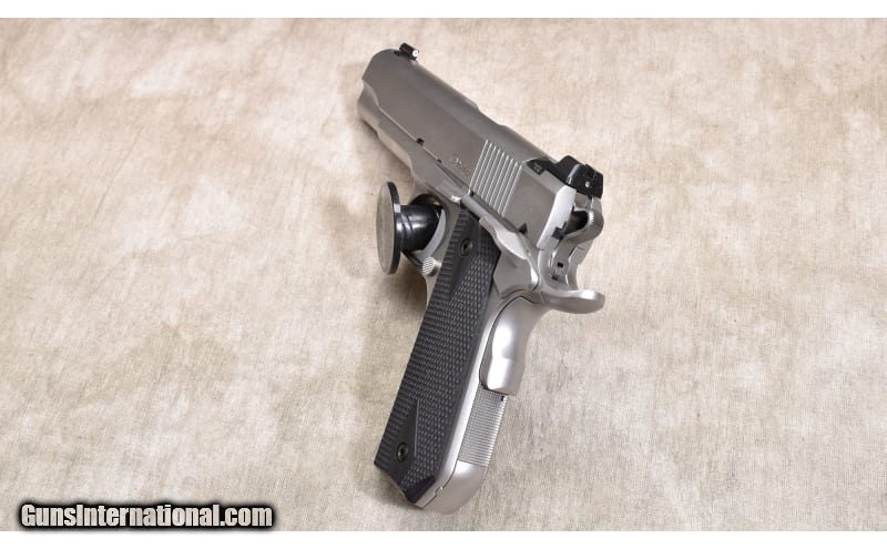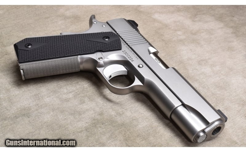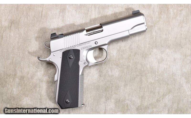 Description: Special buy Dan Wesson 1911 with bobtail grip, knurled front and back straps, all satin stainless steel, and match barrel. 10mm Auto SOLD Chambers: 8-round magazine Metal Condition: New gun. Wood Condition: New gun. Bore Condition: New gun. Barrels: 4-1/4 inch Triggers: Factory single action trigger. Butt Pad: Checkered hard rubber grips. Weight: 37 oz. Sights: Post and notch. Item Location: Rogers |