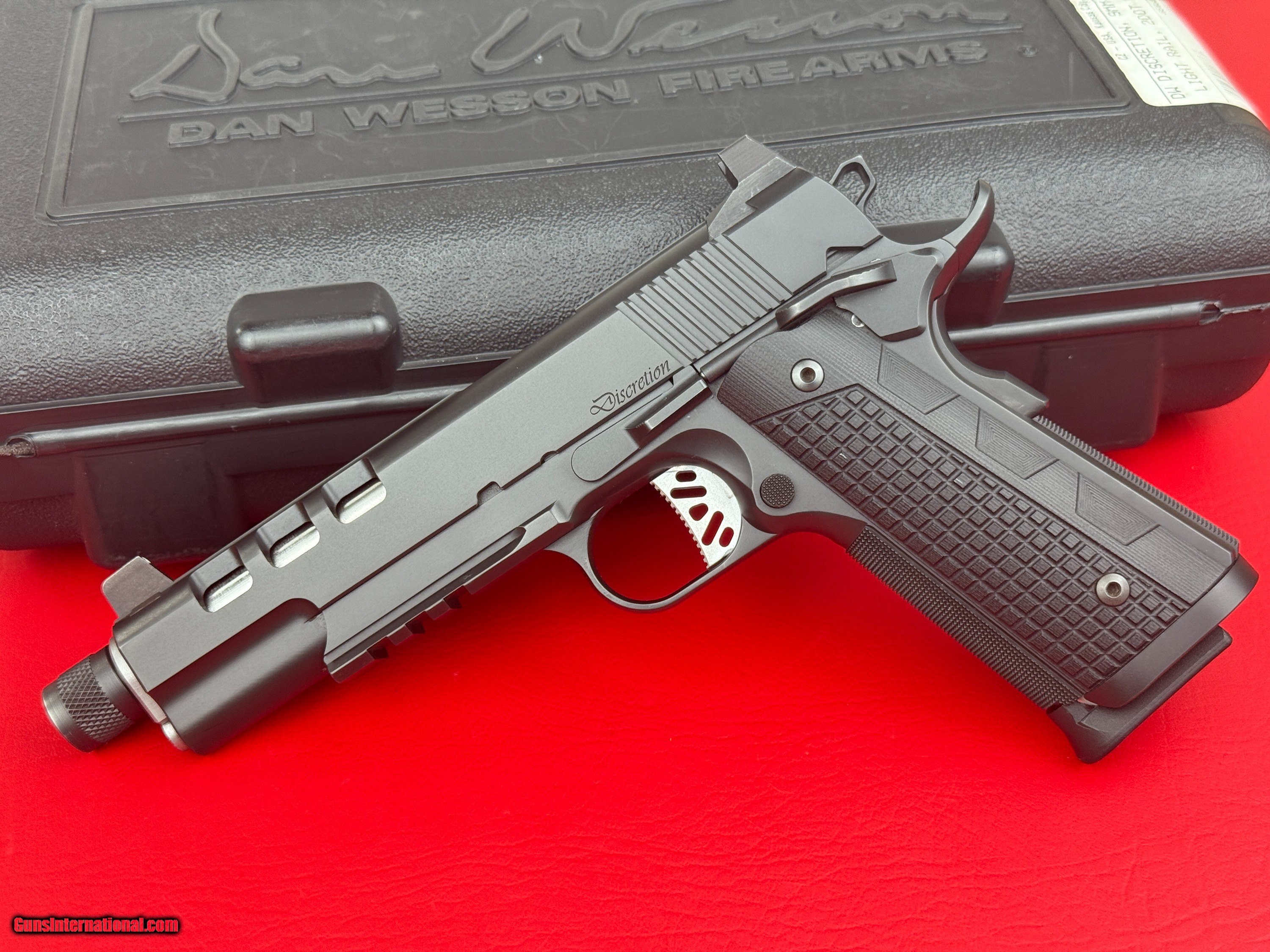 Description: This Dan Wesson Discretion 9mm is in excellent condition. The pistol features a sleek, tactical design with a suppressor-ready threaded barrel, high profile night sights, and a distinctive tri-cut slide for reduced weight and faster cycling. The frame and slide exhibit a flawless finish, reflecting its careful handling and maintenance. Included are the original box and paperwork, along with two 9-round magazines. SPECS: