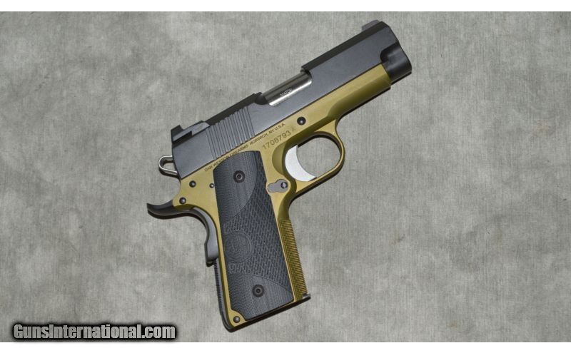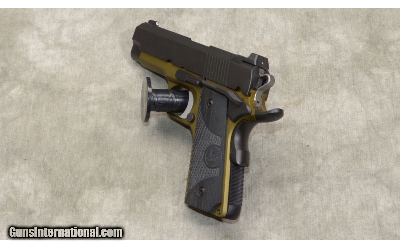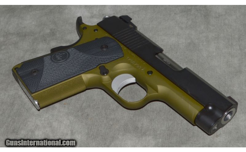 Description: This easy carry Officer's model size 1911 features Trijicon night sights, OD Green frame, match grade Stainless steel barrel, light weight and G10 grips. SOLD Caliber Info: .45 ACP. Chambers: 7 + 1 capacity semiautomatic. Metal Condition: LNIB. Wood Condition: LNIB. Bore Condition: LNIB. Barrels: 3 - 5/8 inch barrel, stainless steel match. Triggers: Single action factory trigger. Stock: G10, with checkering. Butt Pad: Knurled back strap. Weight: 27 oz. Sights: Trijicon night sights. Extras: Case, factory papers, wrench and two magazines total. Item Location: Rogers,, MN |