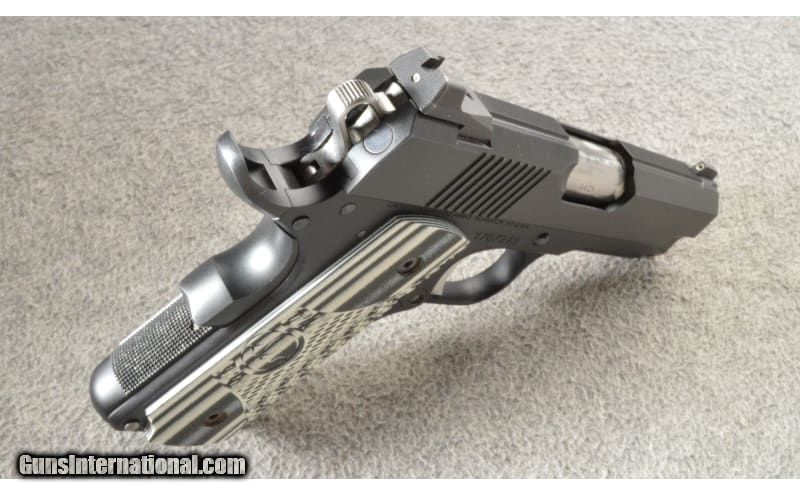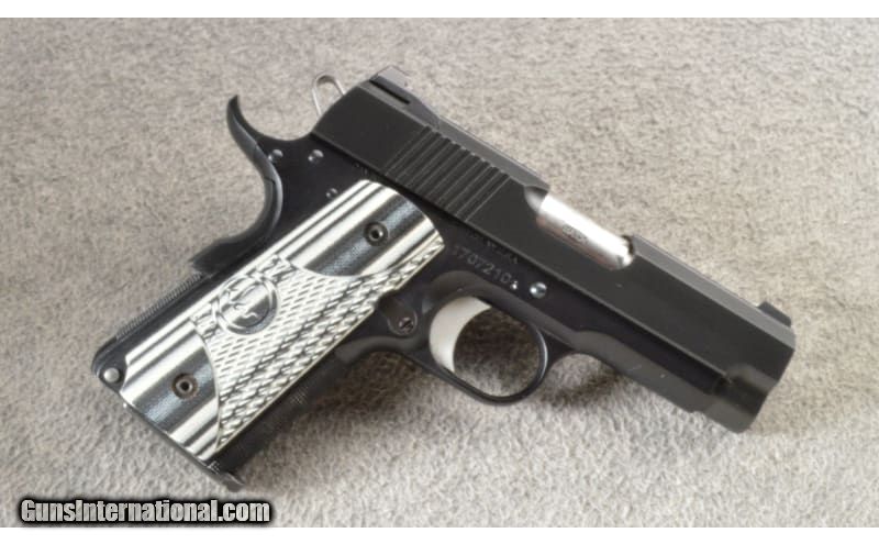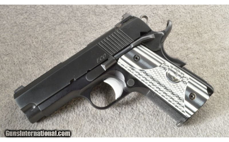 Description: This Dan Wesson ECO is chambered in 8 MM with a 3.5" bull barrel. This Officer's model size 1911 features Trijicon night sights, black frame finish, match grade Stainless steel bull barrel, and G10 grips. Light wear on contact surfaces and the left side slide by the muzzle. Comes with factory hard case, manual and cable lock. This is a used factory second. Overall, in excellent condition. 9mm Luger SOLD Chambers: 8+1 semi auto. Metal Condition: 95%. Bore Condition: Bright strong bore. Barrels: 3.5" barrel. Triggers: Single. Weight: 1.75 lbs Sights: Night sights. Item Location: Owatonna, MN |