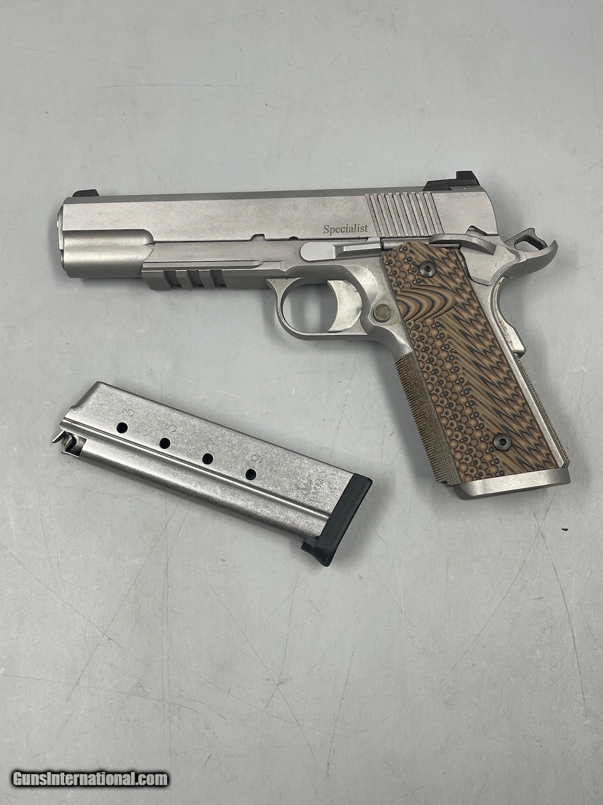 Description: Guns Listing ID: 900789 A full-size 1911, the Specialist is chambered in 9mm and loaded with features to satisfy a public servant’s special requirements. The forged stainless steel slide wears our inverted top rib with a single amber tritium dot in the rear sight and a green lamp with a white target ring in front. It could use a good clean up. SOLD Manufacturer: DAN WESSON FIREARMS Model: SPECIALIST Caliber Info: 9MM LUGER (9X19 PARA) Condition: Used - Non-Certified Barrels: 5 BARREL Finish: STAINLESS |