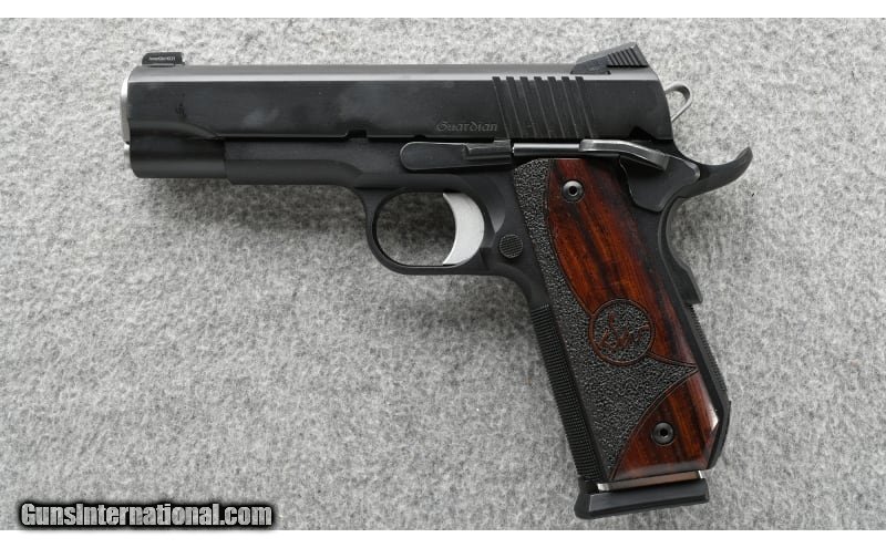 Description: A stunning firearm, Dan Wesson created the Guardian. With an aluminum frame, the Guardian is the lightest 1911 in the Dan Wesson lineup, and makes a fantastic concealed carry firearm that combines the slide of a Commander with a bobbed mainspring housing, 9mm Luger SOLD Chambers: 9 mm Luger in a ten round detachable magazine semi-automatic pistol Metal Condition: "Very good, shows little use Wood Condition: Grip panels are excellent Bore Condition: Bright and Sharp Barrels: 4.25" Match Grade Triggers: Solid aluminum adjustable Weight: 32 oz. Sights: Ameriglo H3 21 tritium night sights Item Location: Grand Junction, CO |