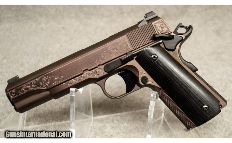 Description: .45 ACP, steel frame engraved with "Heirloom", 5 in. barrel, large beavertail and commander style hammer, SA trigger, brass bead front and u-notch rear sight, black G10 grips, manual thumb/grip safety, decorative scroll engraving, Bronze PVD finish, limited manufacturing. Item is in excellent overall condition, with only one visible ding on the thumb safety. Ships with its original box and two magazines. .45 ACP SOLD Item Location: Greenville, SC |