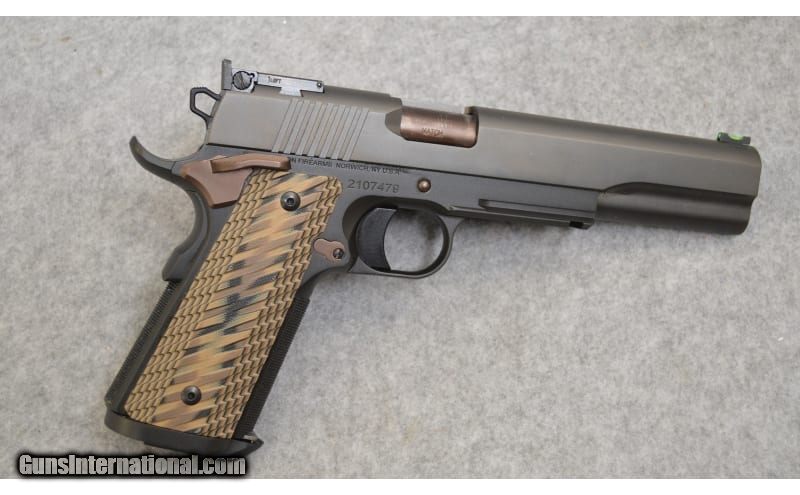 Description: One of our most popular 1911 models, the Kodiak packs a punch with a 6-inch bushing-less barrel chambered in 10 mm. These features give the Kodiak a longer sight radius, less felt recoil, less muzzle flip, and increased accuracy while letting full-power 10 mm loads achieve their potential. Fully adjustable sights, a rail on the dust cover for a light or laser mount, and an additional magwell give this Dan Wesson classic an edge, while an ambidextrous safety makes it easy to use for left-handed shooters. Complete with a Duty finish. This pistol is in excellent condition. 10mm Auto SOLD Chambers: 10 MM Auto Metal Condition: Excellent Bore Condition: Bright and shiny Barrels: 6" barrel Triggers: Crisp Weight: 3.01 Sights: "Iron sights (adjustable rear sight, and fiber optic front sight). Item Location: Huntsville, AL |