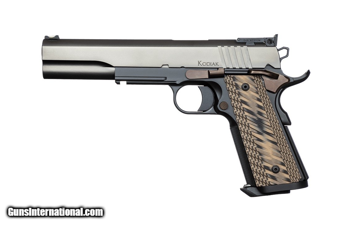 Description: Manufacturer: Dan Wesson Model: Kodiak SKU: 01852 Caliber: 10mm Capacity: 8 Rounds Barrel Length: 6.03" Frame: Forged Stainless Slide: Duty Finish Finish: Stainless / Black Overall Length: 9.7" Grips: G10 Sights: Adjustable Rear, Fiber Optic Front Manual Thumb Safety / Grip Safety Weight: 47.1 oz All Items are factory new in box unless otherwise stated. Based on the information available to us, the above specifications describe this item to the best of our knowledge. For further information, please contact or visit the manufacturer's . SOLD |
