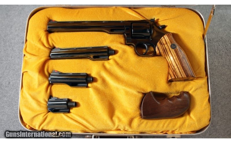Description: The Dan Wesson Model 15-2V Pistol-Pac comes cased with set of barrels: 2.5, 4 and 6 inch and accessories. The barrels are interchangeable and use an externally mounted nut on the muzzle end to secure the barrel and shroud. This set would be a great addition to any collection. .357 Magnum SOLD Metal Condition: Excellent Wood Condition: Very good with some dents on the bottom edges Bore Condition: Excellent with signs of use Barrels: 8 inch barrel Triggers: Double action Weight: 46 oz. Item Location: Lehi, UT |