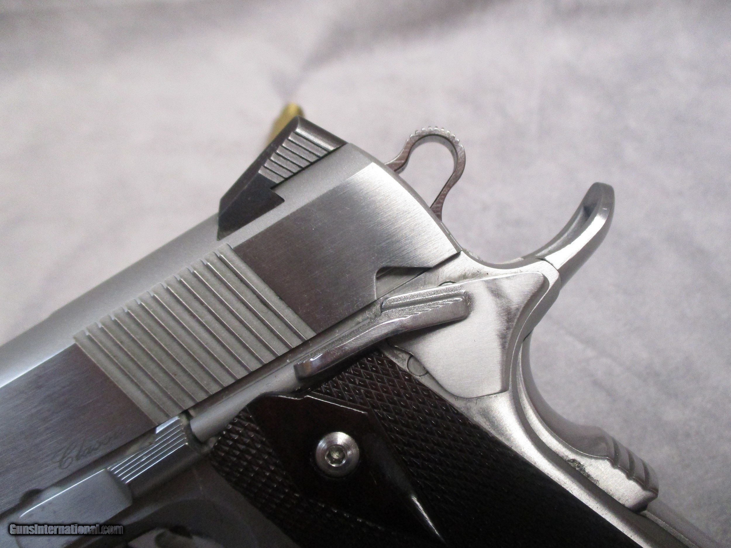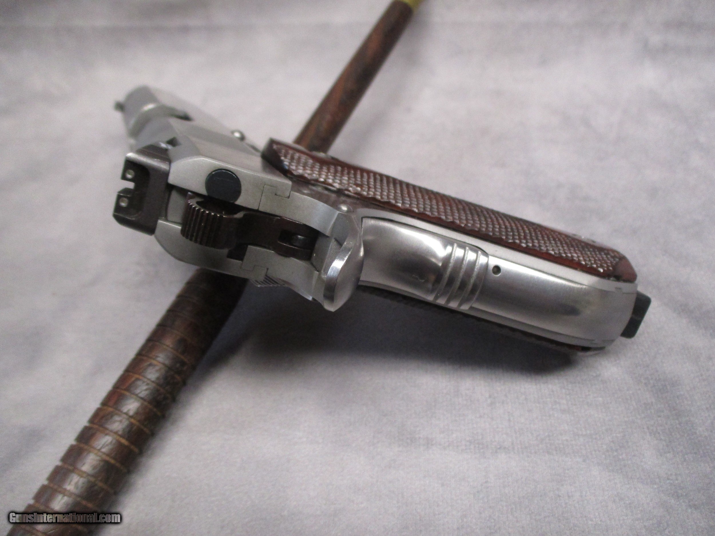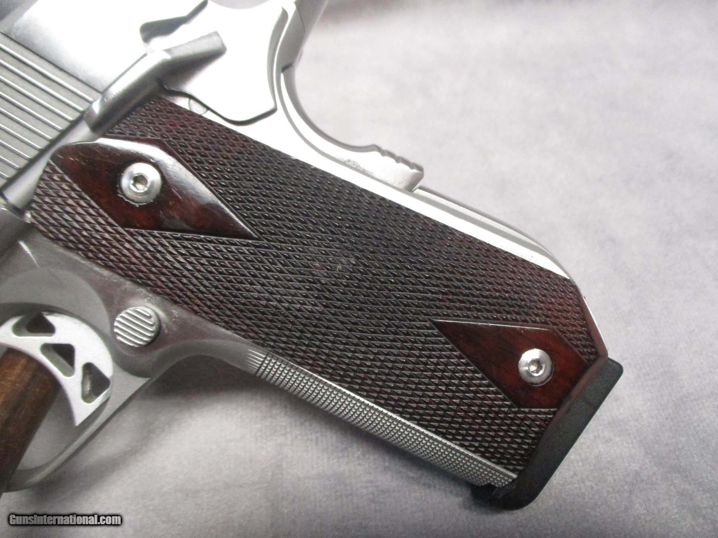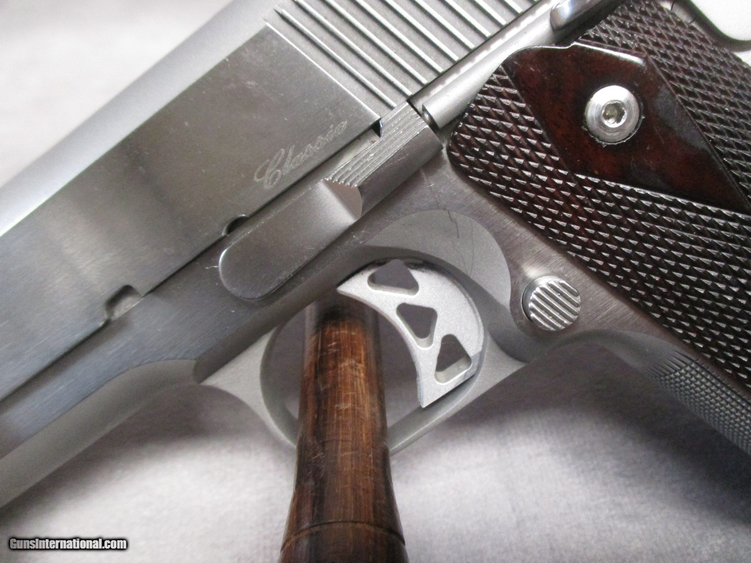 Description: The Colt 1911 is perhaps the most famous semi-automatic pistol ever made having a long and successful carrier in both military and civilian use. The 1911 and its cartridge, the famous .45 ACP, were designed by John Moses Browning to fulfill a requirement by the U.S. Army for a new service pistol which would also become the first semi-automatic to be officially adopted by the U.S. Army, replacing the M1909 revolver in .45 Colt in service. The 1911 proved to be one of the most reliable and durable semi-automatic pistols ever designed, successfully serving the U.S. Armed Forces through World War I, World War II, Korea, and Vietnam. The 1911 has long been popular in shooting circles as a match or target pistol. The Dan Wesson Commander Classic is a Model of 1911 with special features making it suitable for concealed carry use. In addition to the Commander’s usual 4-1/4 inch long barrel, the Classic has a Bobtail frame for less printing in clothing and to reduce fatigue in the clothing. Clothing exposed to sharp edges invariably results in a hole in the shirt. The safety is of extended length for easier operation in lowlight conditions. The sights are Trijicon and are night sights. Magazine capacity is 8 rounds. It is in good condition and shows few signs of wear. The grips show light handling wear. The frame has the typical scratch when someone does not know how reinstall the slide lock correctly during reassembly. The night sights are in perfect working order. There is some were to the finish on the bottom of the trigger guard. The bore is a little dirty but there is no rust or pitting. The pistol should make an excellent CCW. The Commander Classic comes with 2 mags, the original box, paperwork, and tools. SOLD Handgun Caliber: .45 ACP (.45 Auto) Manufacturer: Dan Wesson Firearms Model: Commander Classic Serial Number: C80664CZ Condition: Excellent - Light Wear Barrel Type: Tilting Action: Single-Action Triggers: Skeletonized Trigger Stock: Wood, double diamond grips Finish: Brushed Stainless Sights: Trijicon night sights, 5.8125 sight radius inches (147.6375mm) Extras: Spare magazine, tools Case: Dan Wesson box |