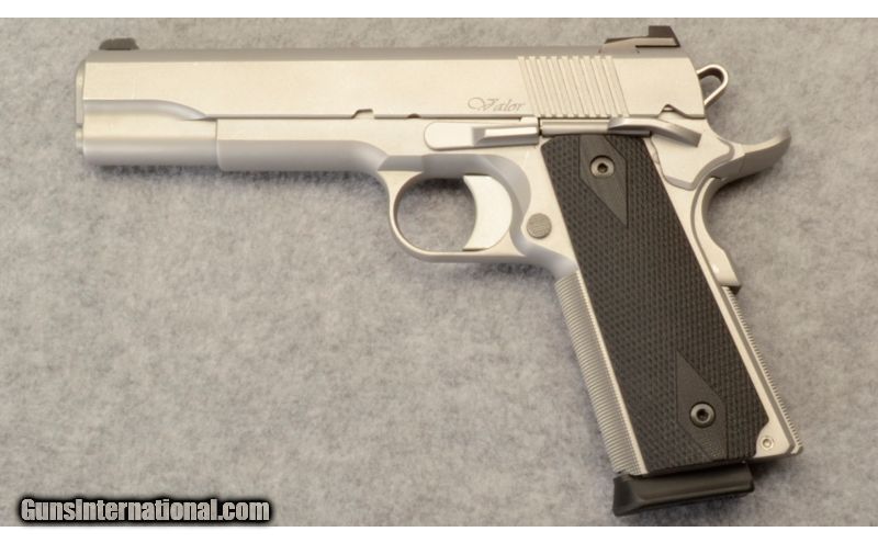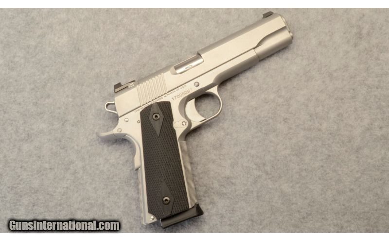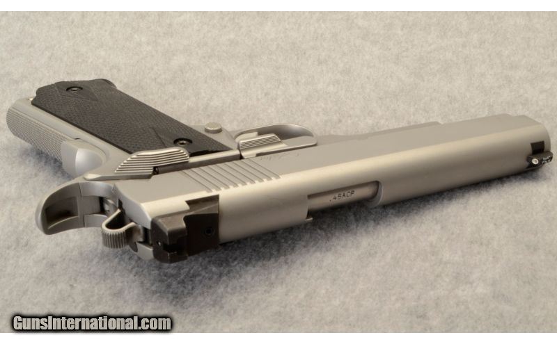Description: This is a Dan Wesson pistol in .45 ACP. Sights are a fixed rear sight and fixed front blade Trijicon night sight. Bore is in excellent condition with strong rifling. Metal is in very good with slight scratching on either side of slide. Grips are plastic 1911 style Dan Wesson grips. Gun is used but is in overall excellent condition. SOLD Caliber Info: .45 ACP. Chambers: 8 round magazine. Metal Condition: Metal is in overall very good condition with slight scratching on either side of slide. Wood Condition: Grips are in excellent condition. Bore Condition: Excellent with strong rifling. Barrels: 5 inches stainless steel. Stock: Plastic Dan Wesson 1911 style grips. Sights: Fixed rear sight and fixed front blade Trijicon night sight. Extras: Comes with factory hard case and one extra magazine. Item Location: Tualatin, OR |
