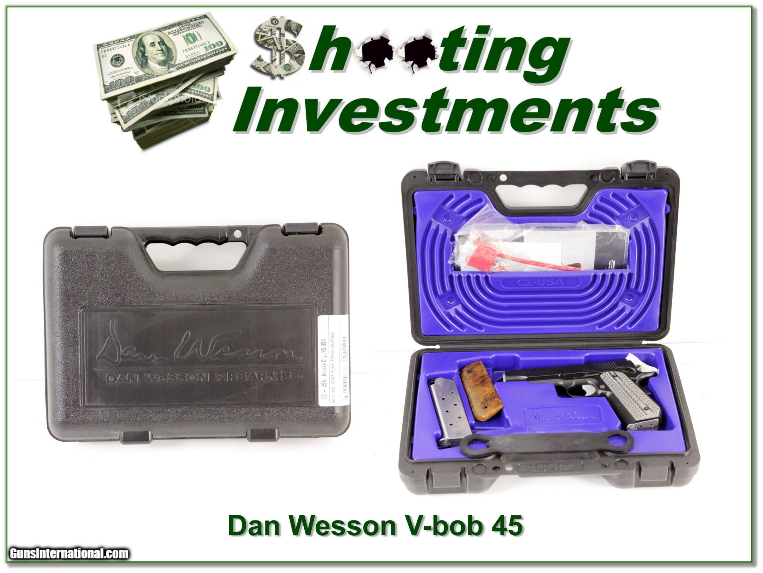 Description: This is a Dan Wesson Valor V-Bob in 45. It has only fired a few rounds. It includes a set of Sarge aftermarket grips as well as the original. I am selling this one on consignment and as such lay-a-way can’t be used. It does of course have the standard 3-day inspection. Shipping and insurance is $39. Please email me with any questions or larger pictures. (Consign your quality firearms with Shooting Investments for only 12%! Let me know if you have any you would like to sell!) 18-0322 Payment: Payment is by Money Order, Cashiers Check or Personal Check. I can now also accept Credit Cards (MasterCard, Visa, Discover & American Express) with a 3% convenience fee. PayPal can be used for some items but never for firearms. Shipping: The shipping charge will be listed in each description. It is $39 for most firearms. Some heavy guns or those insured for over $2000 will be higher. Shipments to Alaska and Hawaii are higher because air shipment is required. Most firearms are shipped on Tuesday and Thursday and usually in 5 days of receipt of payment. We package all shipments carefully and insure them. Optics are shipped Priority Mail and most other non-firearm shipments are shipped First Class. Returns: Our return policy is simple. If for any reason you are not pleased with your purchase, you may return your item for a full refund of purchase price. Ammunition cannot be returned. It is important to us that you are happy. Guns cannot be fired or dissembled before returning them and they must be returned in the same condition as received. Notification of a return must occur with-in 3 days of receipt at your dealer. Shipping, convenience and dealer fees are not refundable and are the responsibility of the buyer. Lay-a-way: If needed, we offer a 60 day lay-a-way option on most firearms. It is 1/3 now, 1/3 in 30 days and 1/3 in 60 days. Lay-a-way firearm sales are final and if not completed the first payment cannot be returned. Consigning your firearms with Shooting Investments: We will help you get top dollar for your firearms. While most local guns shops charge 20% or more, our fee is only 12% with a minimum of $75. At your local gun shop it might take months to sell. Selling on-line provides instant access to thousands of interested buyers. You won’t find any other on-line dealer willing to sell your firearms for only 12% or listing every gun on 3 separate s. Selling through an House typically costs the seller 15% and the buyer an addition 15% (so 30%) and you have to wait several months to sell and longer to receive funds. If properly priced, we will sell your firearms in a few weeks. Send us an email or give us a call and we’ll explain how easy it is for you to get top dollar. Trading: Trading for use is really just buying your gun to re-sell. If you have a gun you want to trade, please email a picture and we will let you know what we can give or it. You will always get more if we sell it for you on consignment. Help for California Buyers: We are happy to ship to California. It is the buyer’s responsibility to make sure any item you buy is legal in your state. We are also happy to help with your purchase of a firearm from someone other than us. If you see a gun you would like to buy but the seller can’t or won’t ship to California they can ship to use and we’ll then ship it to your California dealer. The cost for this service is only $30 + shipping. Let us know if we can help! SOLD |