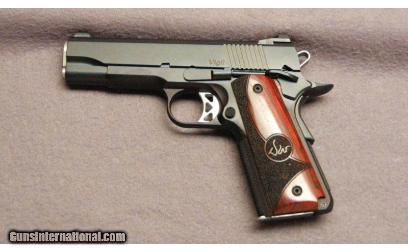 Description: Dan Wesson Vigil Pistol.45 Auto. Appears as new with 2 mags and hard case. Excellent fit and finish, lightweight hammer, extended grip safety and crisp trigger pull. Pistol also has fine checkereing on the front strap and main spring housing. A great choice for concealed carry for persons trained in the use of 1911 style single action handguns. SOLD Caliber Info: .45 Auto. Chambers: Semi-auto. Metal Condition: Appears as new. Wood Condition: Grips appear as new. Bore Condition: Bright. Barrels: 4 1/4" Barrel., alloy frame. Triggers: Single action, aluminum trigger, lightweight hammer, extended grip safety and safety lever. Stock: Factory wood grips. Weight: 32 Ozs. Sights: Iron notch rear, night sight insert front sights Extras: With 2 mags and hard case. Item Location: La Vista, NE |