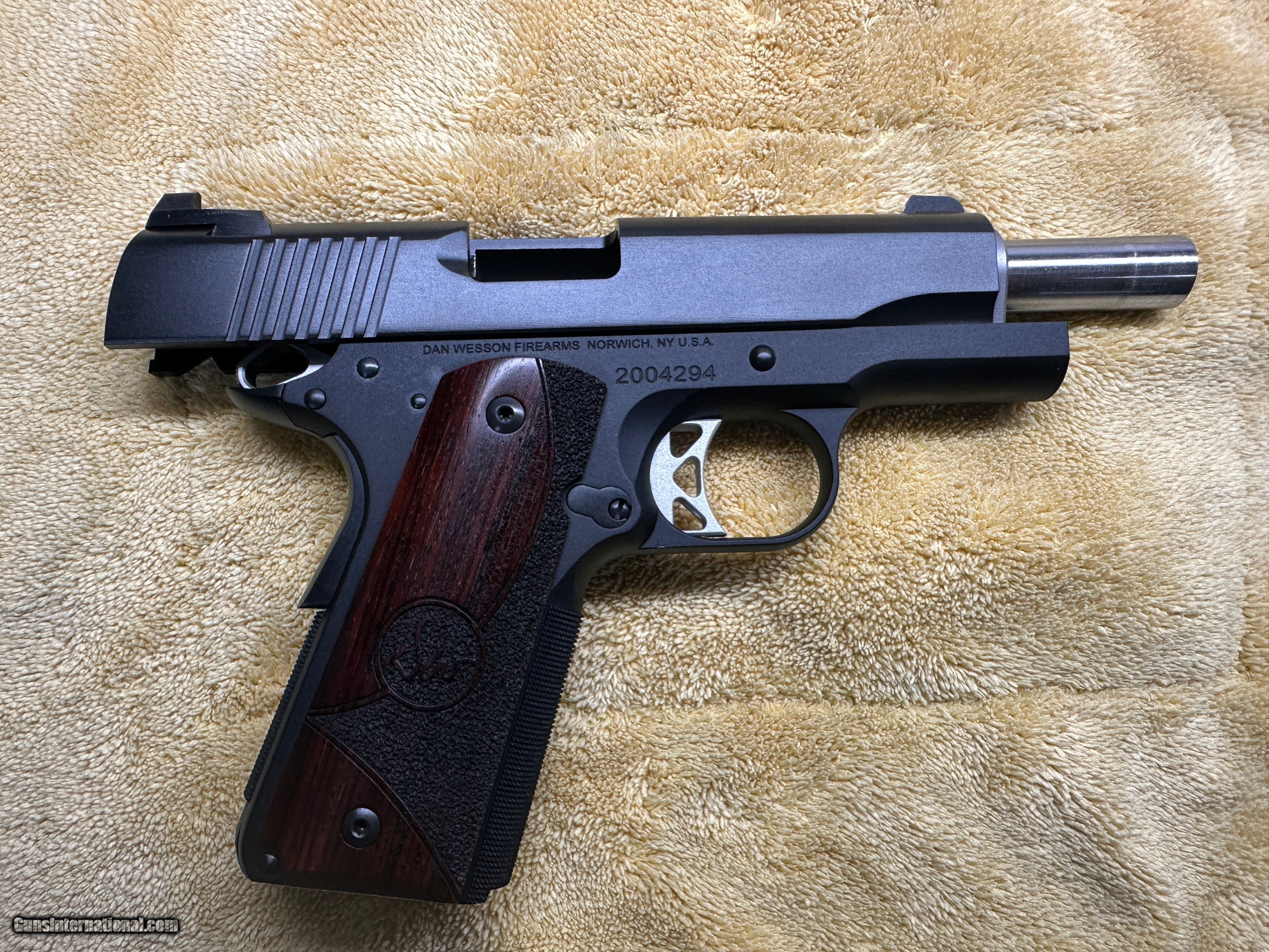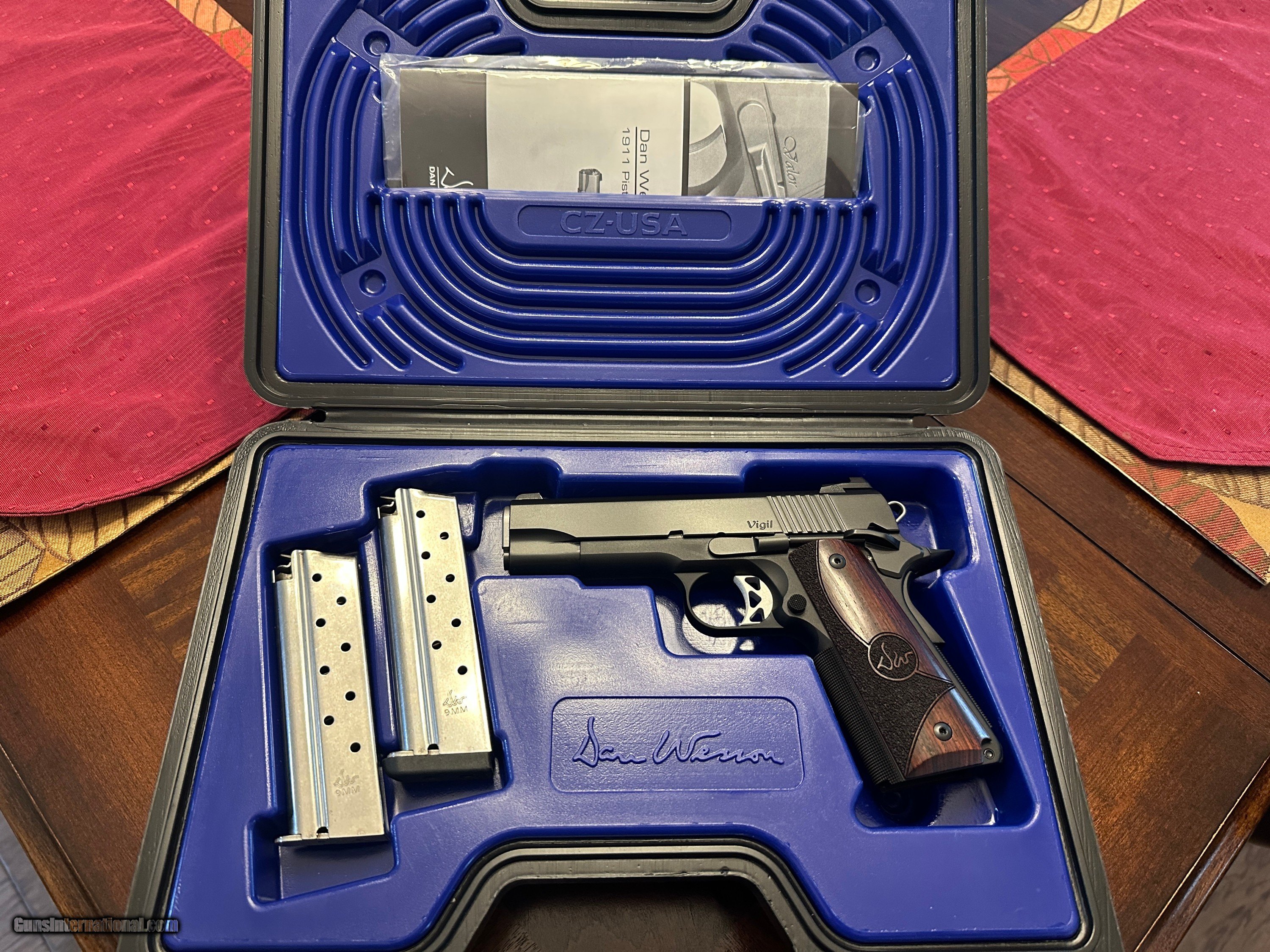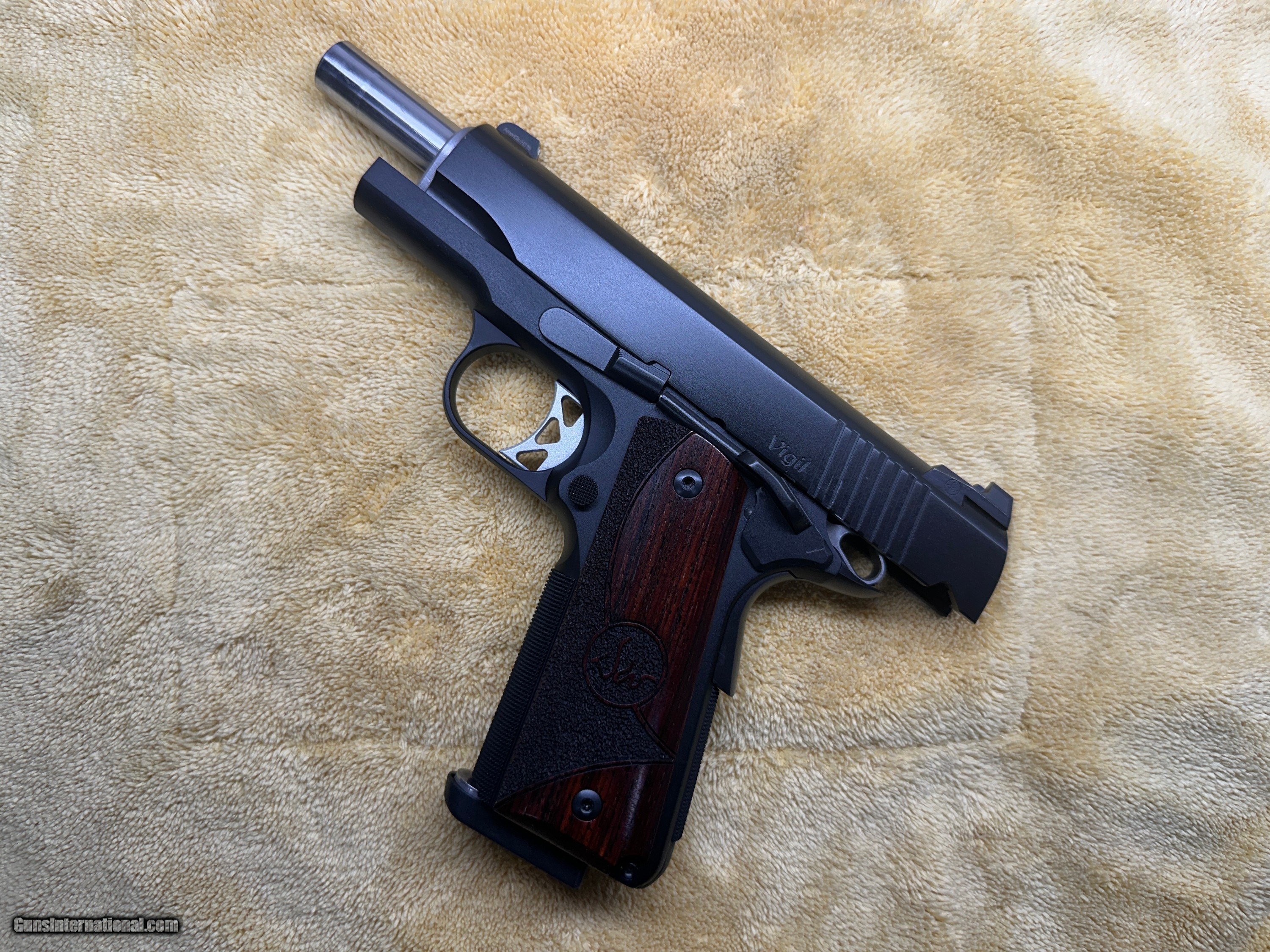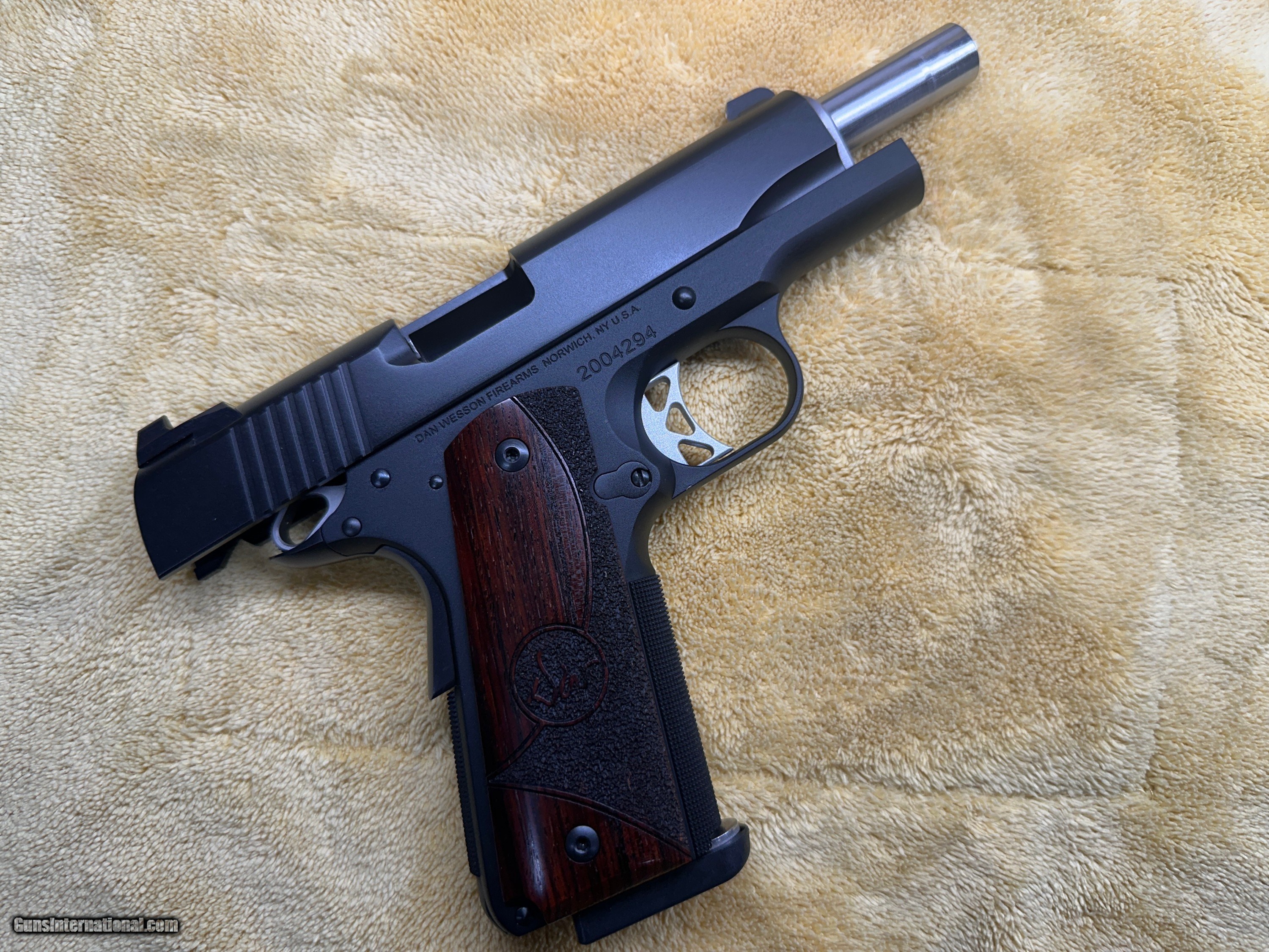 Description: Dan Wesson Vigil 1911 Commander 4.25" 9mm Low round count, Excellent Condition, Shoots Well no issues. Comes with original Box, Manual, 2) 9 round Dan Wesson Magazines - Serial number 2004294 Specifications 1911Commander Caliber 9mm Capacity 9 Rounds Frame MaterialForged Aluminum Slide Finish Black Duty Finish Grips Wood Overall Length 7.9 in 4.25" Match barrel Barrel Length 4.25 in Width1.45 in Weight 30.5 oz Aluminum Trigger Mech Single Action Front Sight Fixed Night Sight Rear Sight Tactical Night Sight Safety thumb safety, grip safety Shipping & Insurance = $35.00 SOLD Handgun Caliber: 9x19mm Parabellum (9mm Luger, 9x19mm NATO) Manufacturer: Dan Wesson Model: Vigil Serial Number: 2004294 Barrel Length: 4.25 Condition: Excellent Metal Condition: Excellent Wood Condition: Excellent Bore Condition: Excellent |