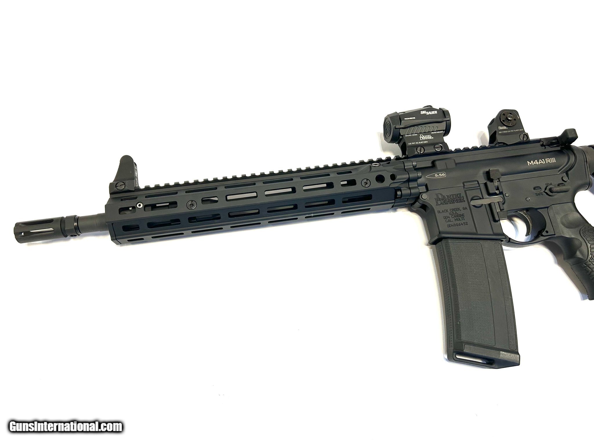 Description: Guns Listing ID: 544059 The M4A1 RIII AR15 style firearm features a fully ambidextrous lower that allows both left- and right-handed shooters to operate the bolt catch, safety selector, and magazine release without having to move or remove their dominant hand from the rifle’s grip. Its GRIP-N-RIP Charging Handle is ambidextrous as well. We’ve taken the RIS II picatinny quad rail used on our M4A1 original and replaced it with a 12.5 inch RIS III rail featuring M-LOK attachment for lighter weight. The M4A1 RIII is built around a 14.5 inch Cold Hammer Forged Government Profile barrel with a permanently attached Daniel Defense Flash Suppressor. This rifle also comes with the ergonomic Daniel Defense Buttstock and Pistol Grip. This rifle comes with Daniel Defense iron sights, hard case and a Sig Sauer Romeo 5 with DD micro mount. SOLD Manufacturer: DANIEL DEFENSE Model: M4A1 RSIII Caliber Info: 5.56X45MM NATO Condition: Used - Non-Certified Barrels: 14.5 BARREL Action: SEMI AUTOMATIC Finish: black |