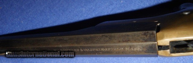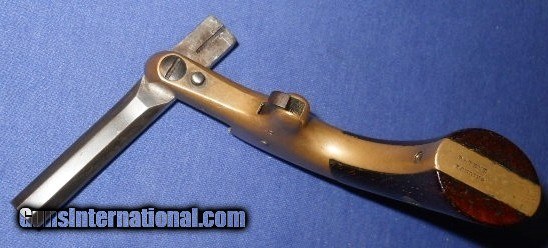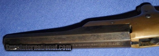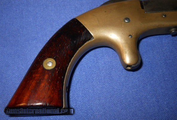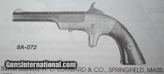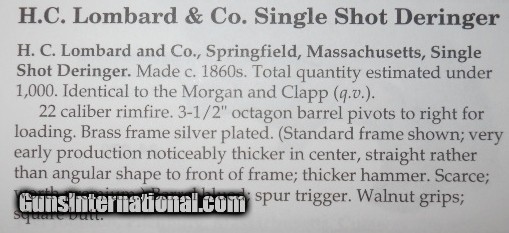 Description: 1860s CIVIL WAR ERA H.C. LOMBARD, SPRINGFIELD, MA .22 RF SIDE SWING DERRINGER. SER. # 975 MATCHING NUMBERS. 3 5/8" OCTAGON BARREL, BORE HAS DISTINCT RIFLING WITH LIGHT PITTING. BARREL MOSTLY AN EVEN SMOOTH BROWN GRAYISH PATINA WITH FAINT TRACES OF ORIGINAL BLUE. CRISP FACTORY MARKINGS "H.C. LOMBARD & Co. SPRINGFIELD, MASS." BRASS FRAME WORN TO OCHRE PATINA WITH MINOR HANDLING MARKS. ROSEWOOD GRIPS NUMBERED TO THE GUN AND RATE NEAR EXCELLENT AS LIGHTLY CLEANED AT SOME POINT. ACTION WORKS FINE CRISP & ROBUST WITH SOMEWHAT LOOSE BARREL LOCKUP & WEAK BARREL LATCH SPRING. A VERY GOOD EXAMPLE OVERALL, AS PICTURED WITH LESS THAN 1000 MADE, $10.00 S&H DIRECT TO BUYER ANYWHERE THAT'S OK. INSURANCE ADDITIONAL COST IF WANTED. SEE ALL "ESTATE ANTIQUES" LISTINGS FOR MORE RECENTLY AQUIRED ITEMS FROM ESTATE COLLECTIONS AT SENSIBLE PRICES. SOLD Antique: Yes Handgun Caliber: .22 Short, .22 Long Manufacturer: H.C. LOMBARD & Co. Model: DERRINGER Serial Number: 975 Barrel Length: 3 5/8 Bore: VERY GOOD Condition: VERY GOOD AS PICTURED Metal Condition: SMOOTH Wood Condition: NEAR EXCELLENT Bore Condition: DISTINCT RIFLING Barrel Type: OCTAGON Action: WORKING Finish: ORIGINAL AGED & WORN Weight: 8.9 oz Sights: FACTORY ORIGINAL |