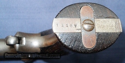 Description: ORIGINAL SHARPS & HANKINS 4 SHOT .32 RF CALIBER PEPPERBOX DERRINGER. MATCHING SERIAL NUMBERS. BORE HAS STRONG RIFLING THROUGHOUT WITH EXPECTED PITTING. METAL SURFACES HAVE MOSTLY TONED TO A MEDIUM GRAY PATINA SHOWING A LITTLE PLUM BROWN UNDERTONES. TRIGGER & SPRING ON BACK OF HAMMER HAVE GOOD REMNANTS OF ORIGINAL FIRE BLUE. FACTORY MARKING ARE QUITE CRISP & FULLY LEGIBLE. VERY GOOD PLUS CONDITION ROSEWOOD GRIPS WITH THIN DRYING CRACK ON LEFT PPANEL THAT IS SEEN IN PICS. ACTION WORKS PROPERLY WITH ROTATING HAMMER NOSE FIRING PIN AND SOLID LOCK-UP. A VERY GOOD EXAMPLE AT A REALISTIC PRICE FOR YOUR COLLECTION. $12.00 S&H DIRECT TO BUYER ANYWHERE THAT'S OK. SEE ALL "ESTATE ANTIQUES" LISTINGS FOR MORE GOODIES AT SENSIBLE PRICES. SOLD Antique: Yes Manufacturer: . SHARPS Model: 3B Serial Number: 12187 Barrel Length: 3 1/2 Caliber Info: .32 RF Bore: GOOD SCATTERED PITTING Condition: VERY GOOD AS PICTURED Metal Condition: ORIGINAL Wood Condition: VERY GOOD Bore Condition: STRONG RIFLING Barrel Type: 4 CLUSTER Action: CRISP & TIGHT Finish: ORIGINAL AGED Sights: FACTORY ORIGINAL Manufacture Date: 1859-1874 |