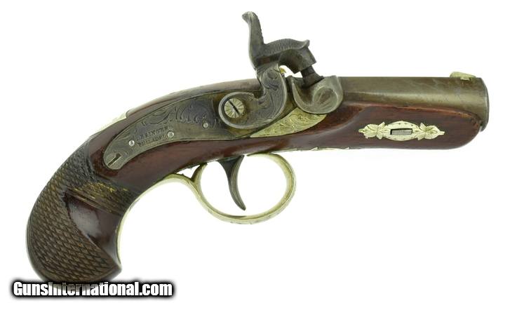 Henrry Derringer Percussion Pistol. .44 Caliber 1 7/8” barrel with a lightly oxidized bore. The barrel is a fading pewter brown, nearing pewter patina with strong remnants of the lightning bolt bronzing still present, with a couple spots of very light oxidation as well. There is a scant dovetailed blade German silver front sight with dual inlaid silver bands at the breech showing appropriate markers marking and sunburst P firing proof. The tang shows some nice light engraving which continues onto the lockplate and the hammer. The lockplate and the hammer shows some trace color case-hardening, the balance a mottled silvery and pewter case-hardened patina. The pineapple triggerplate extension, bow of guard, cap splash plate, wedge escutcheons and flourish sideplate all show the typical light tasteful engraving with teardrop shaped gripcap and shield shaped monogram plate showing only very light borderline engraving, the triangle nosecap plate unegraved. The stock rates a very fine to perhaps near excellent showing much original varnish, only showing scattered flaking, with crisp checkering in the grasping area. The lock is crisp and mechanically functional. A very attractive 5 5/8” overall length Derringer pocket pistol.