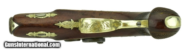 Description: Henrry Derringer Percussion Pistol. .44 Caliber 1 7/8” barrel with a lightly oxidized bore. The barrel is a fading pewter brown, nearing pewter patina with strong remnants of the lightning bolt bronzing still present, with a couple spots of very light oxidation as well. There is a scant dovetailed blade German silver front sight with dual inlaid silver bands at the breech showing appropriate markers marking and sunburst P firing proof. The tang shows some nice light engraving which continues onto the lockplate and the hammer. The lockplate and the hammer shows some trace color case-hardening, the balance a mottled silvery and pewter case-hardened patina. The pineapple triggerplate extension, bow of guard, cap splash plate, wedge escutcheons and flourish sideplate all show the typical light tasteful engraving with teardrop shaped gripcap and shield shaped monogram plate showing only very light borderline engraving, the triangle nosecap plate unegraved. The stock rates a very fine to perhaps near excellent showing much original varnish, only showing scattered flaking, with crisp checkering in the grasping area. The lock is crisp and mechanically functional. A very attractive 5 5/8” overall length Derringer pocket pistol. SOLD |