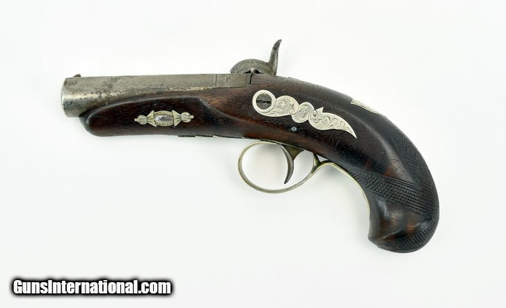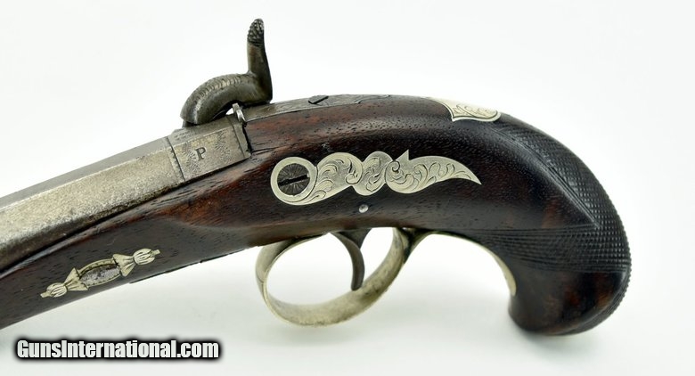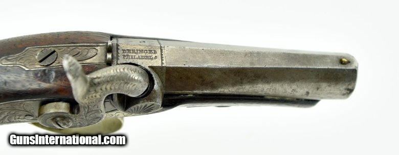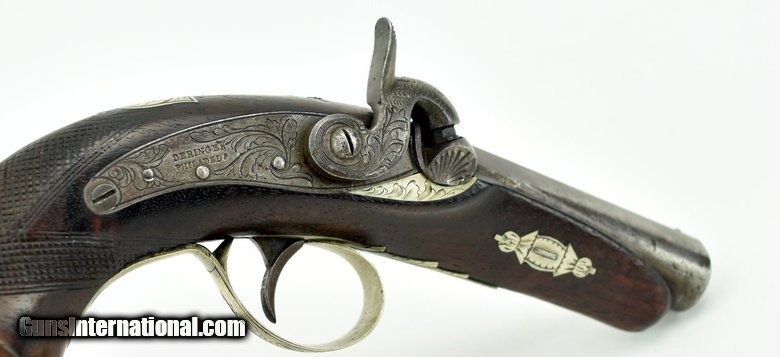 Henry Deringer nice sharp gun. Barrel is 3 ¼” and the total length is about 7” in total length. Gun is in .44 caliber. Engraving is nice and sharp. Mechanics are excellent.