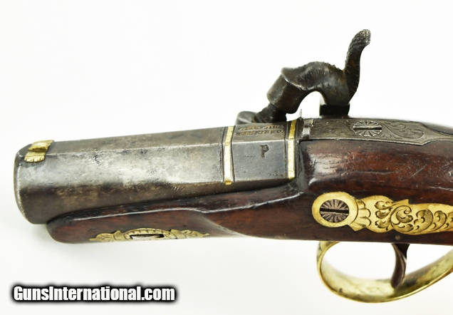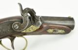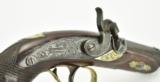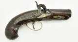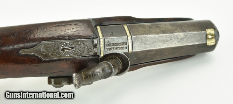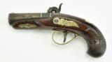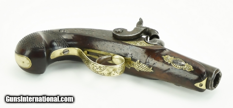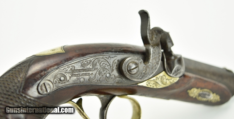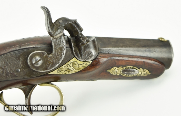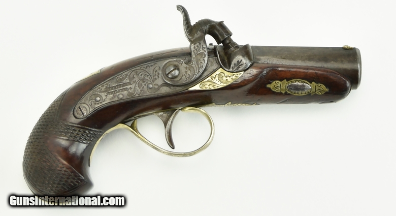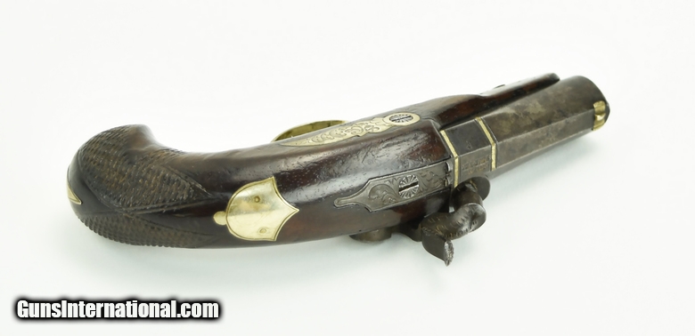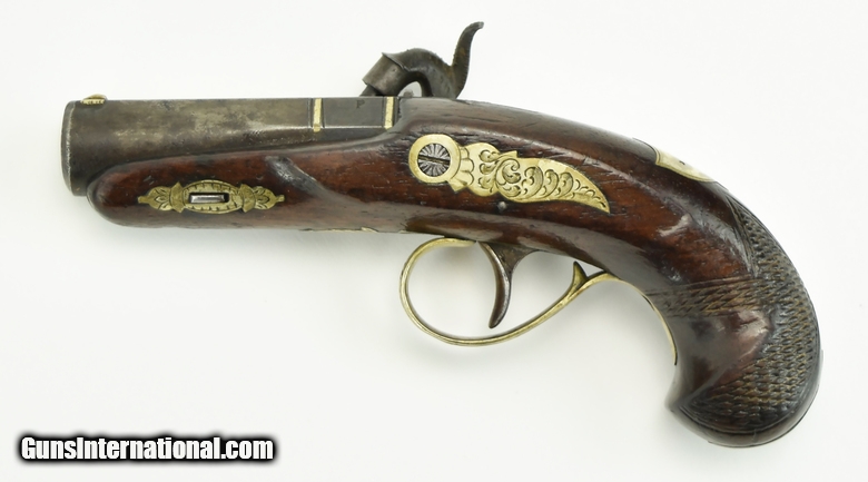 Henry Deringer percussion Derringer barrel length 2 ½”. Silver fittings and silver barrel bands. Condition is very good plus. Very fine example.