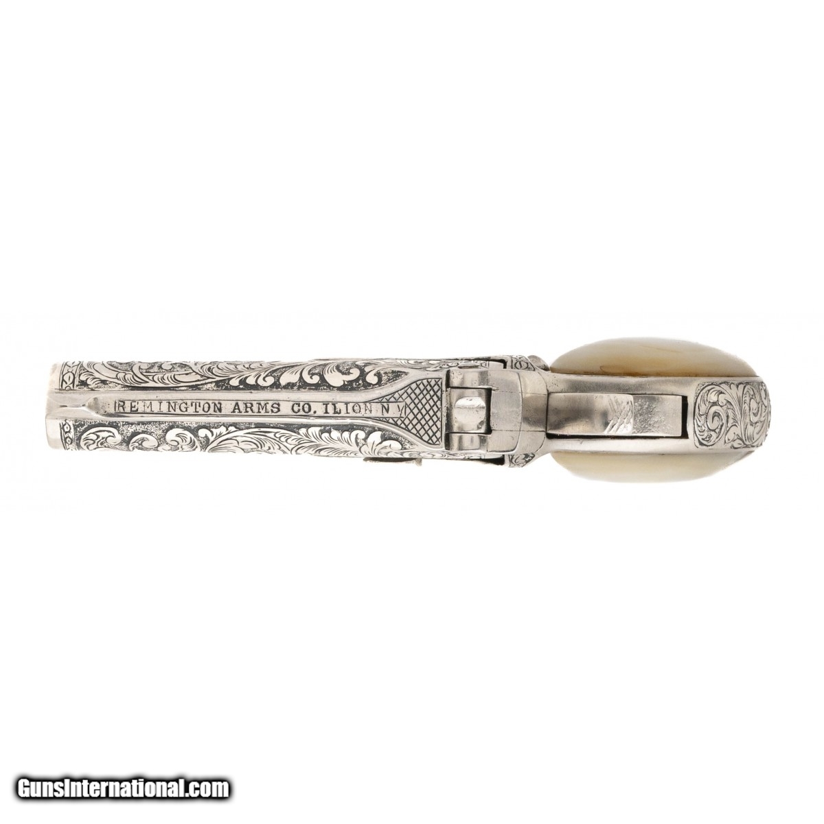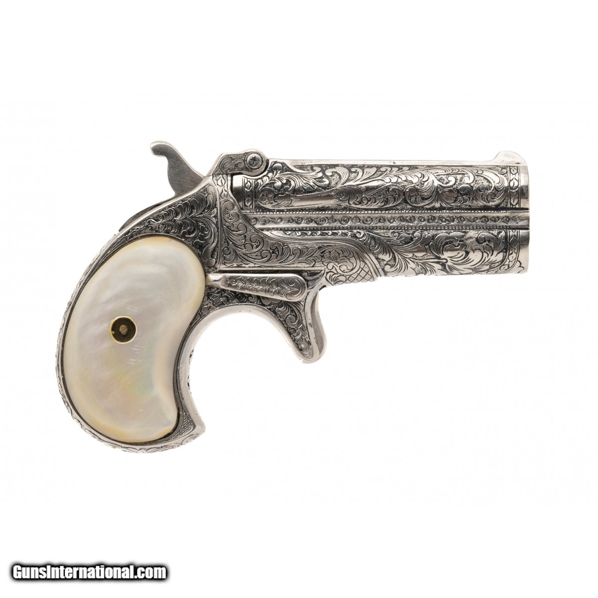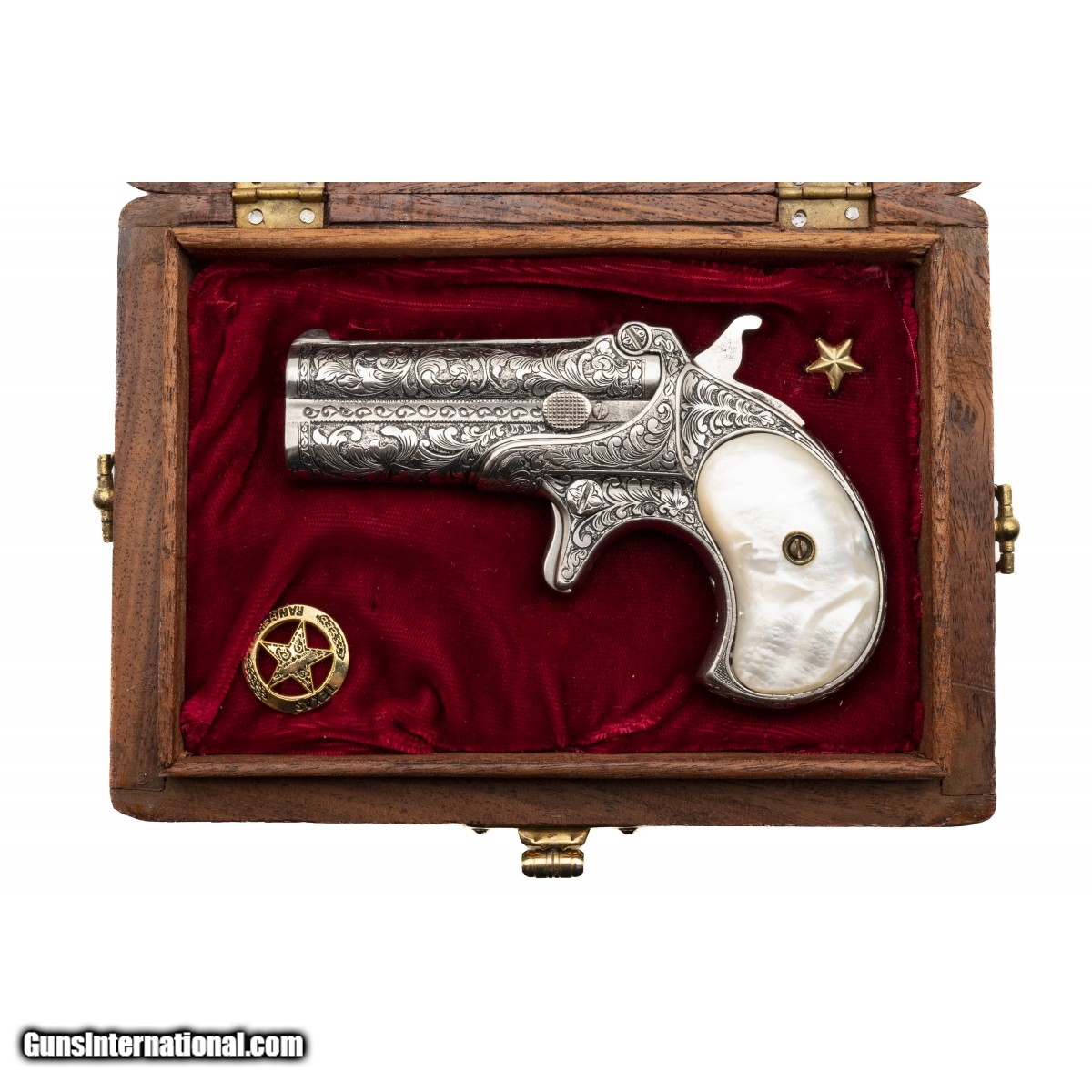 Description: "Serial number L523. Made Pre 1898. Very fine engraved Remington over / under derringer. This gun is possibly engraved by the master Ben Shostle, but more likely engraved in his style. This gun comes in a beautifully carved wood case with bone inlays. SOLD Antique: Yes |