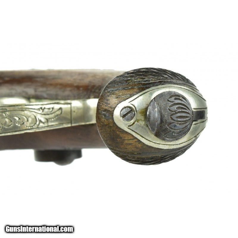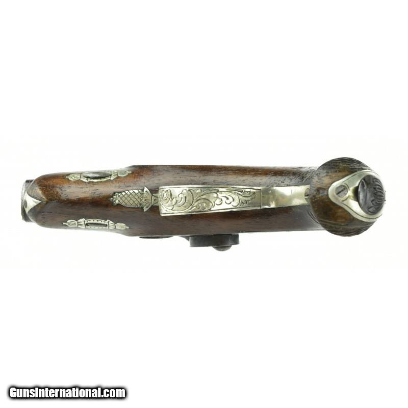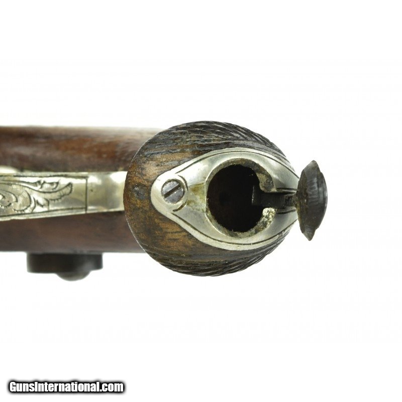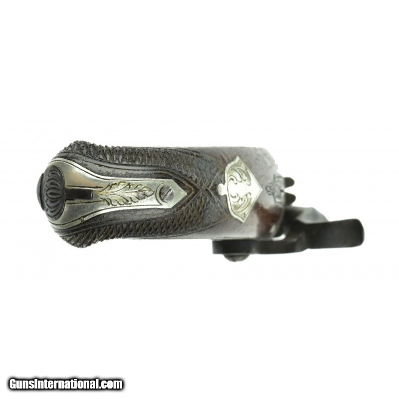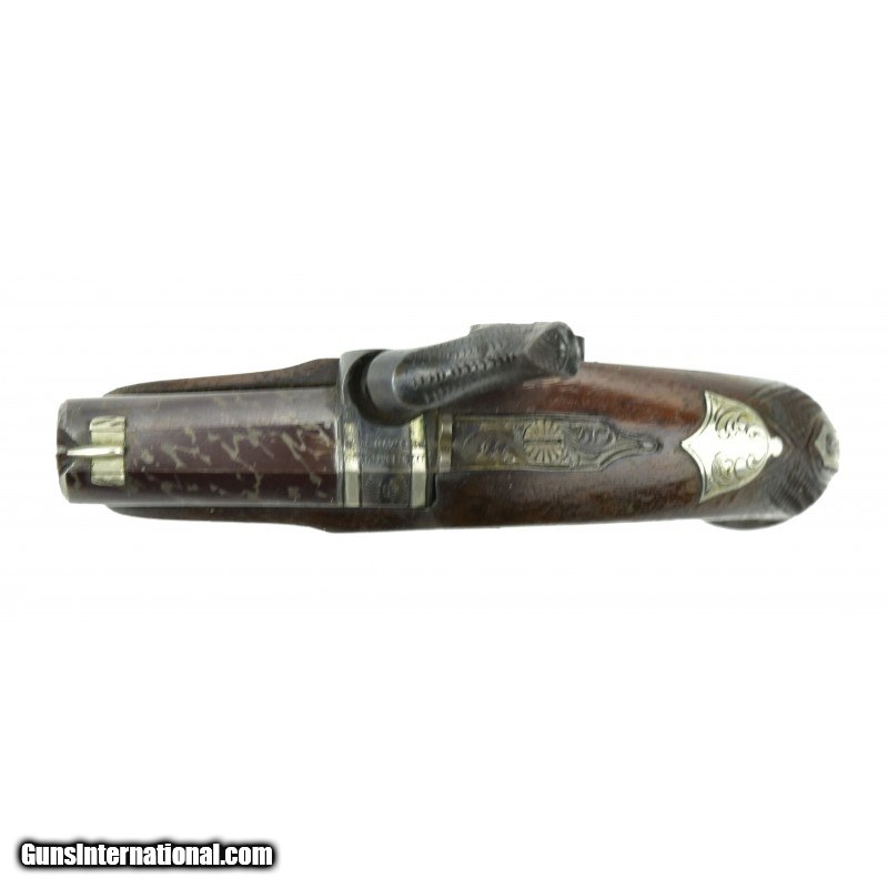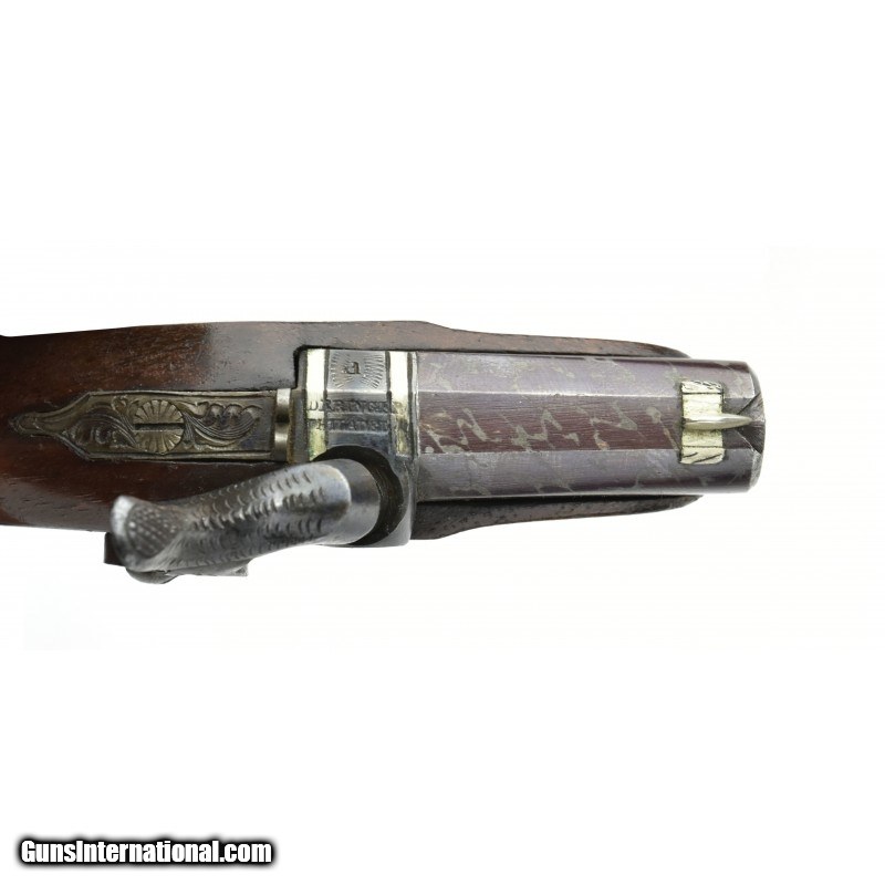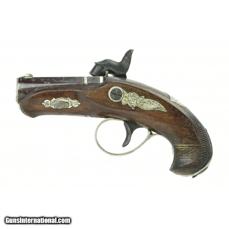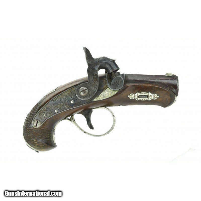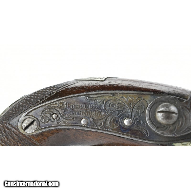 Description: "Excellent Peanut Size Henry Deringer .41 caliber pistol. .41 Caliber with a 1 ½" barrel. Beautiful condition with all of the original brown finish with striping on barrel. Two silver bands are on the breech. Excellent case colors remain on the lock. Trap in butt. All of the furniture is nicely engraved. About as good as you could ask for! SOLD Antique: Yes |