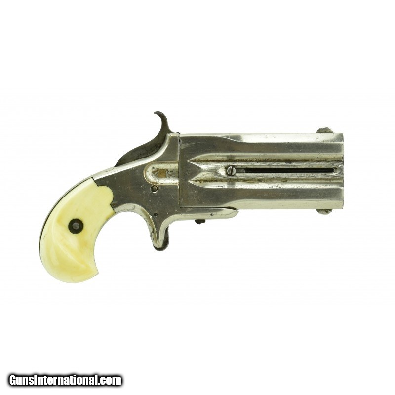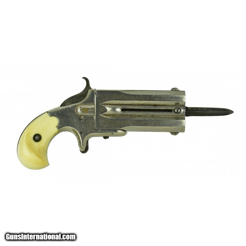 Description: "Frank Wesson .41 Caliber Rimfire. Large frame over/under Derringer with retractable bayonet. Very good bore. Perfect original ivory grips. This scarce large frame has an old re-nickel but parts of the patent dates are legible. Action works perfectly. Scarce large frame. Backstrap is expertly engraved of the period. “W.O.Fletcher." SOLD |
