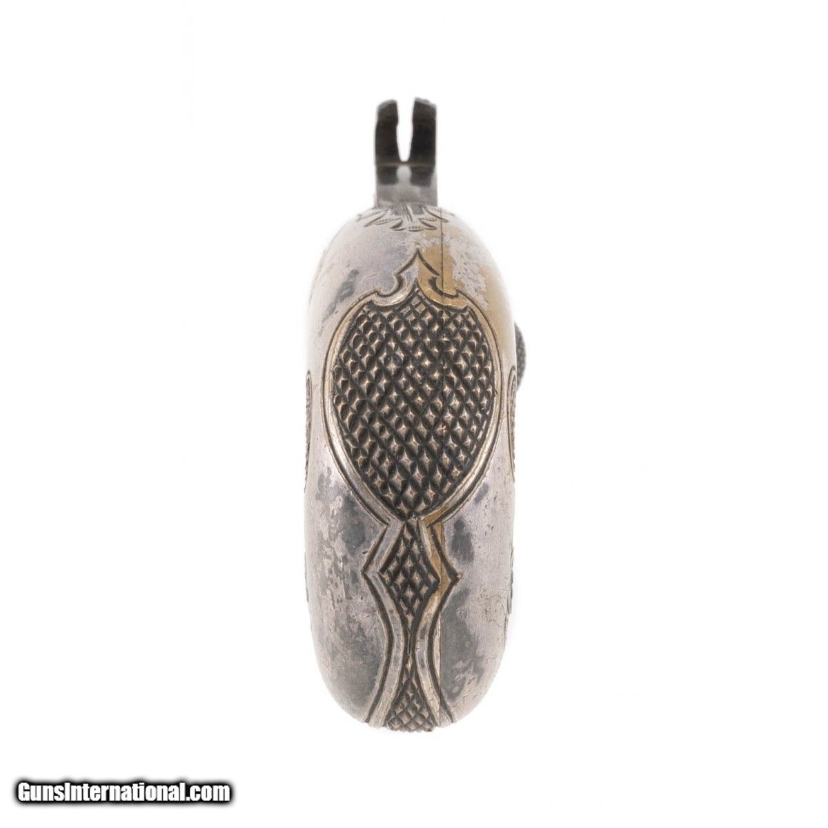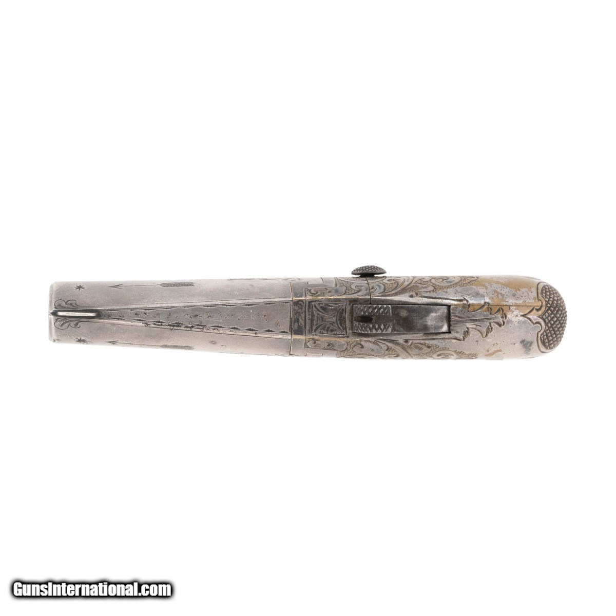 Description: " This 41 rimfire caliber Moore's Patent derringer has a silver plated frame and barrel. Approx. 75% of the silver remains with wear on the high spots. There is decorative scroll engraving on the frame and breech of the barrel. The rifled bore is fine with good rifling and a little roughness at the chamber. The top of the barrel marked MOORE S PAT. F.A. CO. BROOKLYN N.Y. is basically unreadable. The bottom has PAT FEB 24 1863 with the serial number, 1711, at the rear. The action functions correctly. This is a nice Moore deringer. SOLD Antique: Yes |