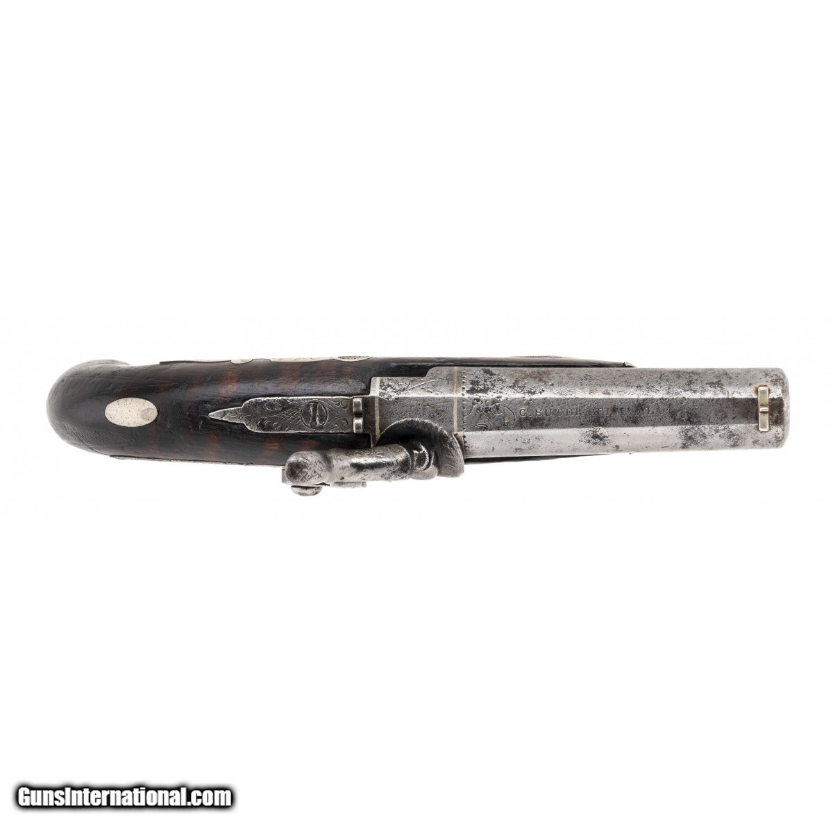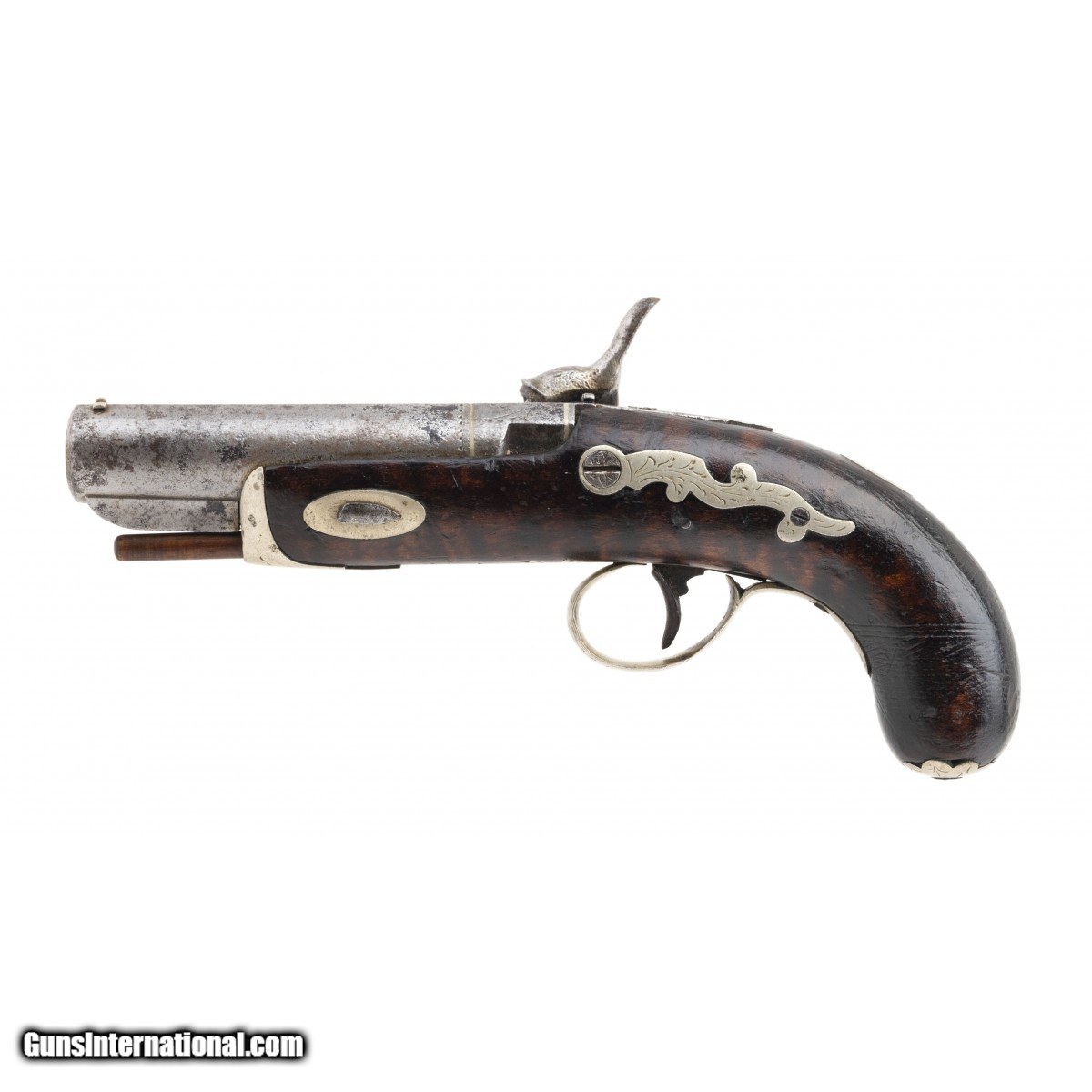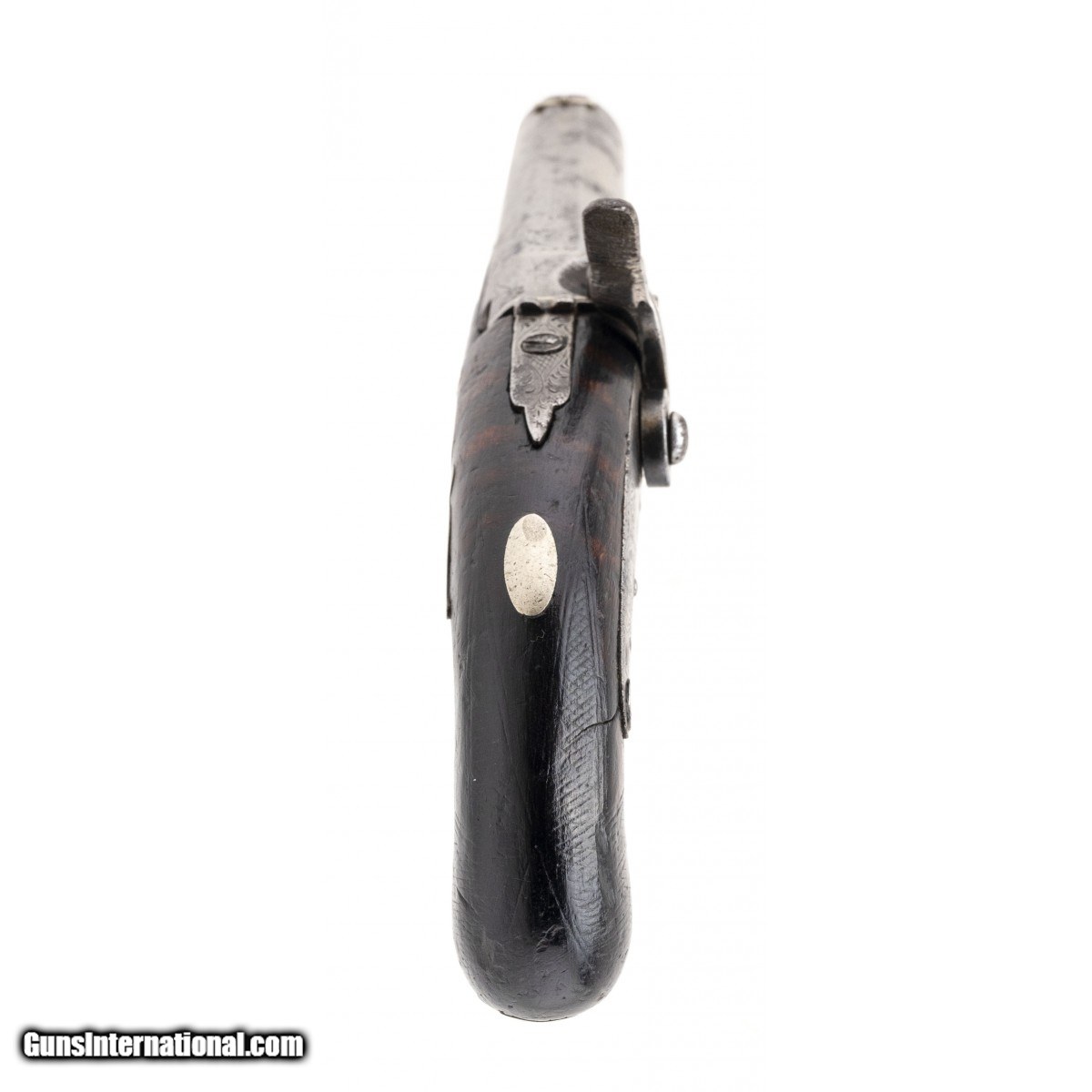 Percussion Henry Deringer type pistol with 3"" . The top of the barrel is marked ""C. Sutler Selma ALA."" The trigger guard finial a pineapple with three point spear head atop a base of three leaves. Flayderman's guide depicts seven Finial types on page 408, this model closely resembles No.5. The action works perfectly. The trigger guard, finial, nosecap and buttcap are all silver. This rare southern dealer marked deringer is the first we have seen.