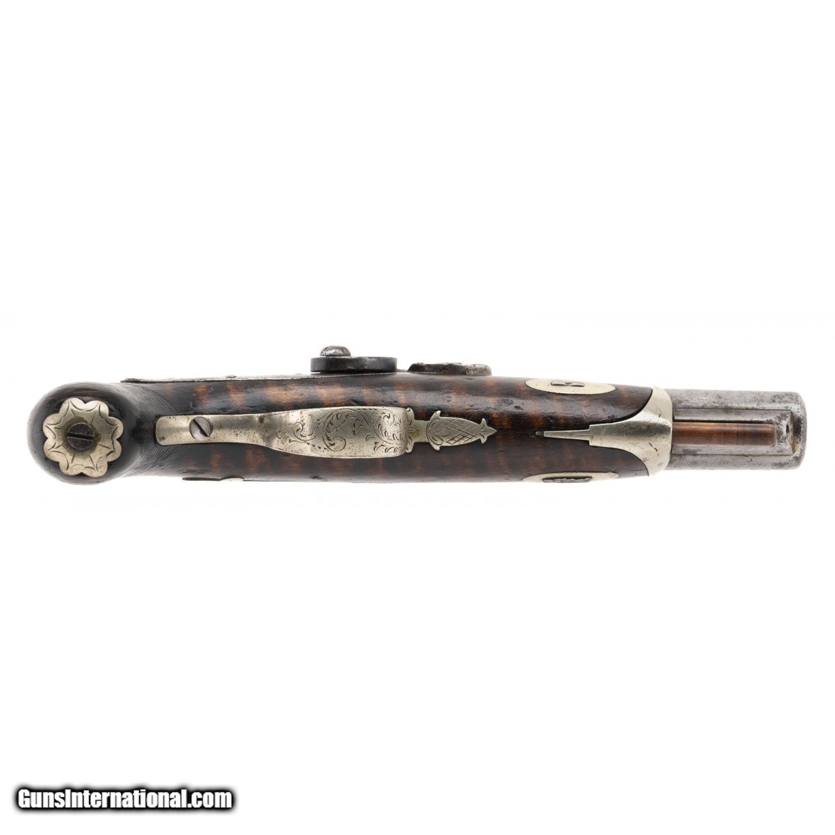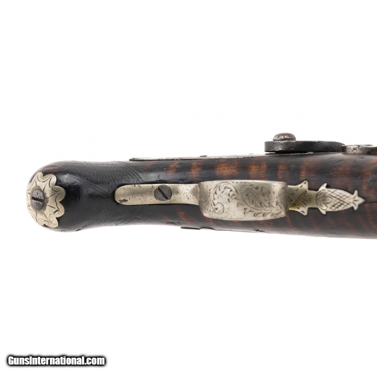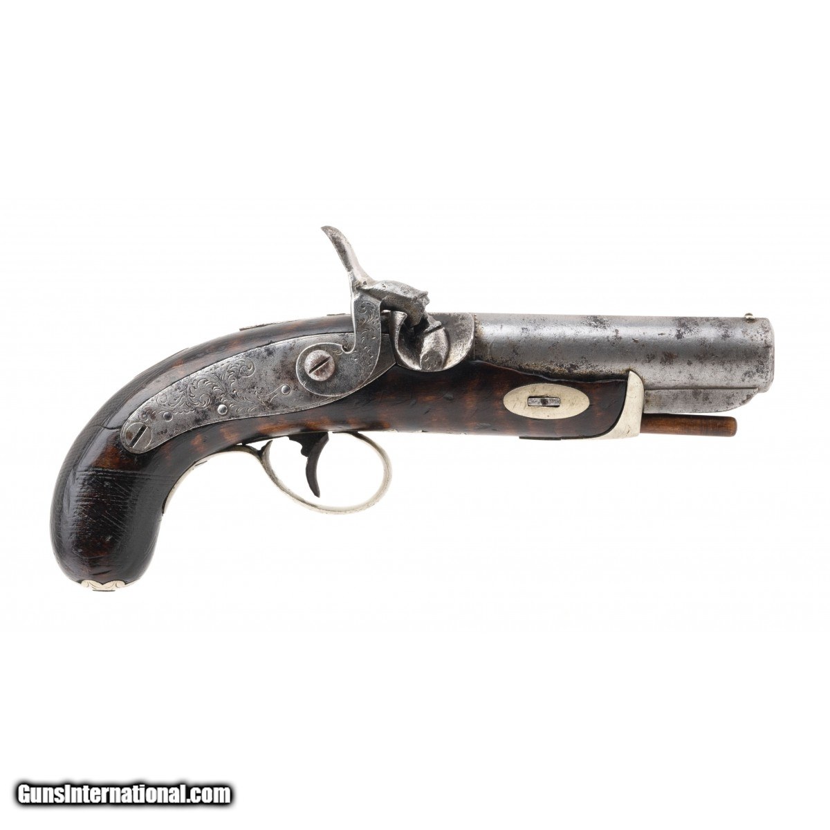 Description: " Percussion Henry Deringer type pistol with 3"" . The top of the barrel is marked ""C. Sutler Selma ALA."" The trigger guard finial a pineapple with three point spear head atop a base of three leaves. Flayderman's guide depicts seven Finial types on page 408, this model closely resembles No.5. The action works perfectly. The trigger guard, finial, nosecap and buttcap are all silver. This rare southern dealer marked deringer is the first we have seen. SOLD Antique: Yes |