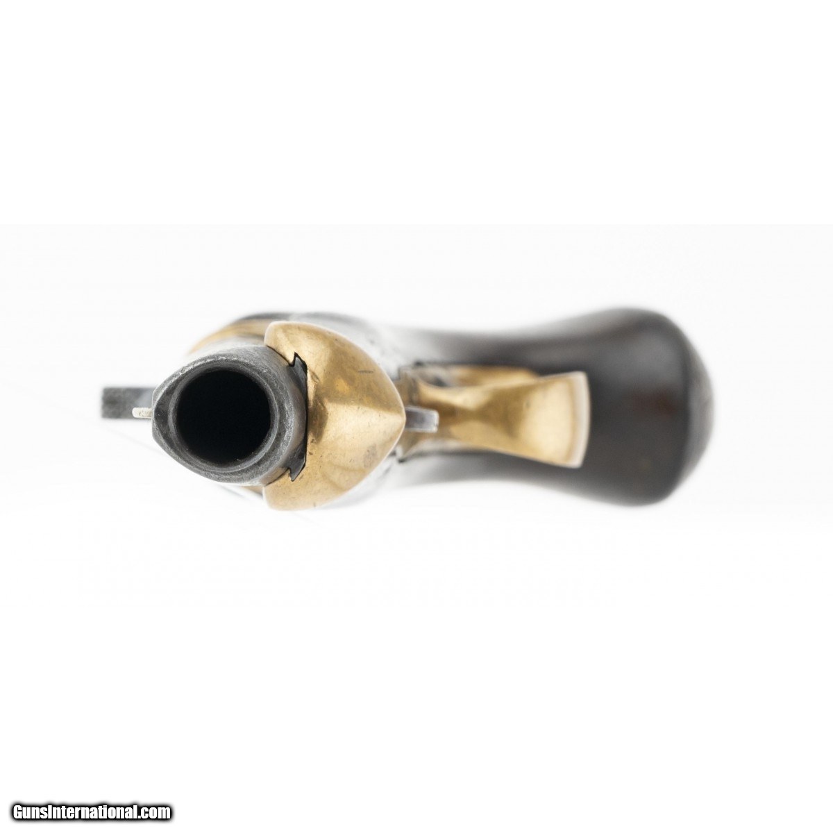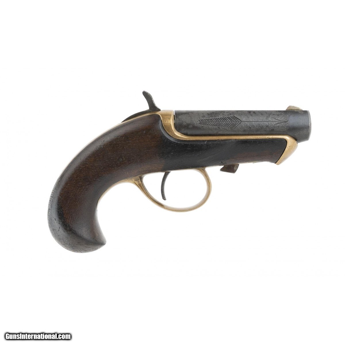 Description: " Barrel slides forward to reload or eject. Comes with a percussion adaptor for firing black powder loads with percussion caps. The frame is of brass. Stock is excellent and the fine checkered butt is excellent. Barrel has a flying arrow on both sides. This is a hard to find derringer and rare to have the percussion adaptor. SOLD |