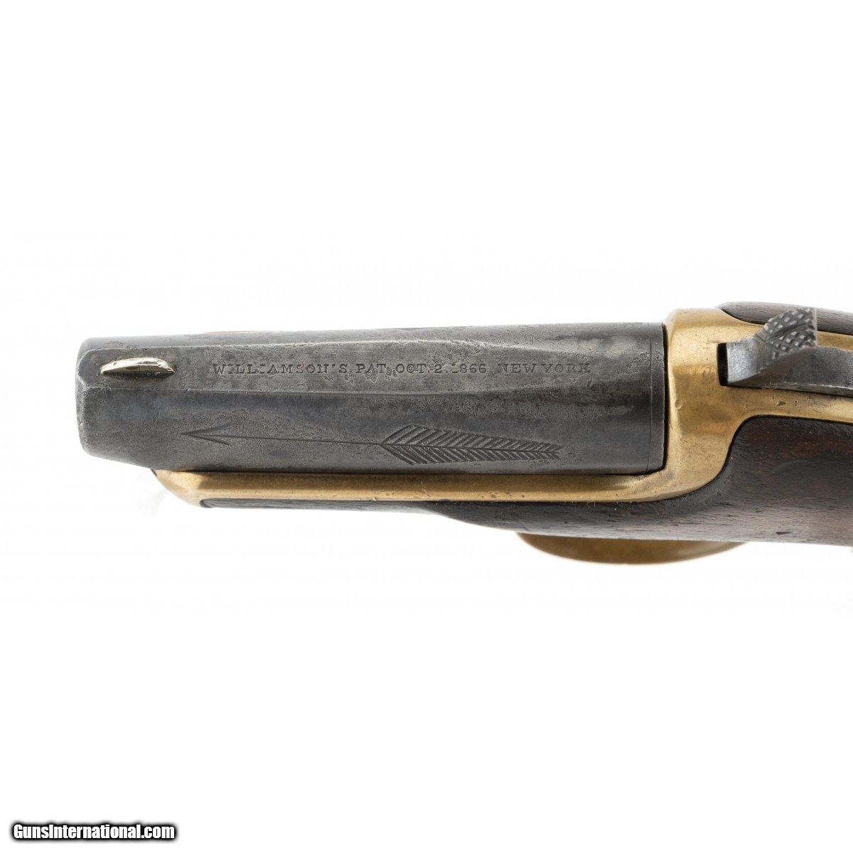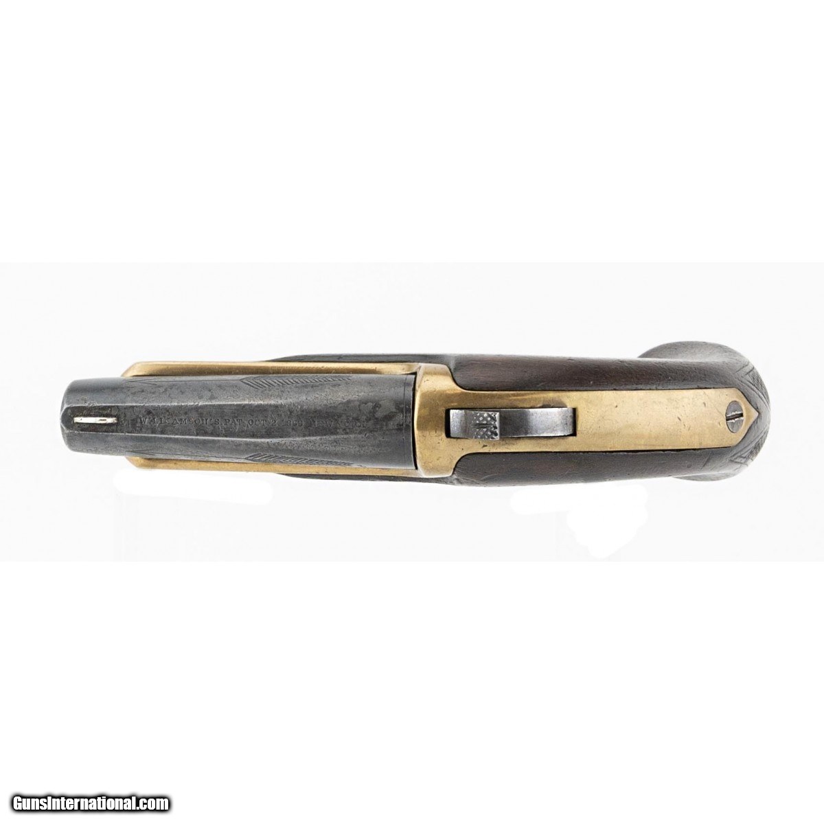 Barrel slides forward to reload or eject. Comes with a percussion adaptor for firing black powder loads with percussion caps. The frame is of brass. Stock is excellent and the fine checkered butt is excellent. Barrel has a flying arrow on both sides. This is a hard to find derringer and rare to have the percussion adaptor.