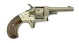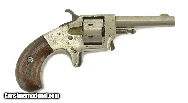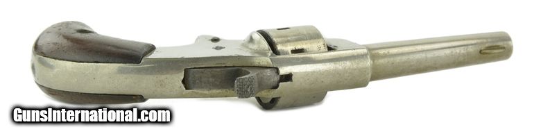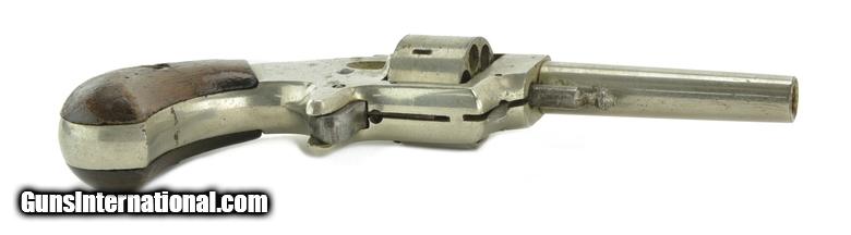 Description: Unmarked .22 caliber Derringer revolver. Made possibly by Hopkins & Allen since they made such a variety of small guns like this with different trade names. Metal has 90% of the original nickel finish. Very good grips. Hammer cocks back, but cylinder is not revolving. SOLD |