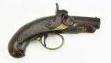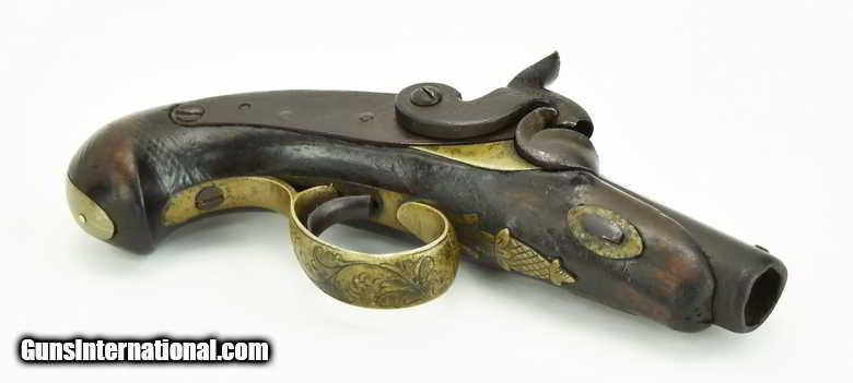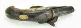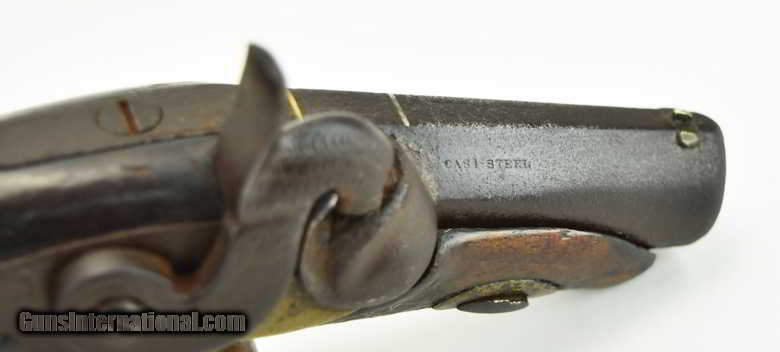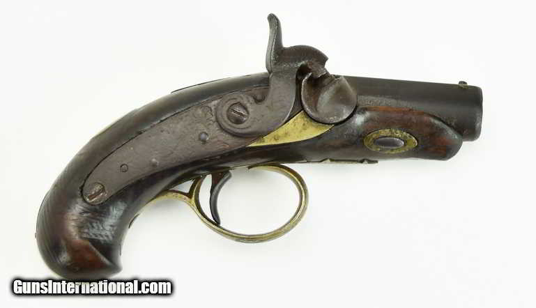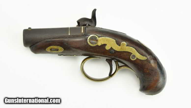 Wurfflein percussion Derringer made in Philadelphia marked “Wurfflein Phila” on barrel. Barrel is 2 ¼” long. Breech plug bands are silver and gold. Action works fine. Stock is good plus. Metal shows wear and fine pits. Reasonably priced Henry Deringer copy (Circa 1850) by one of Henry’s many competitors.
