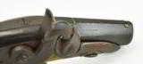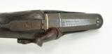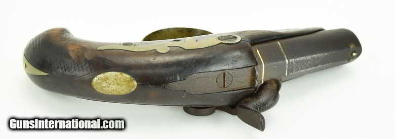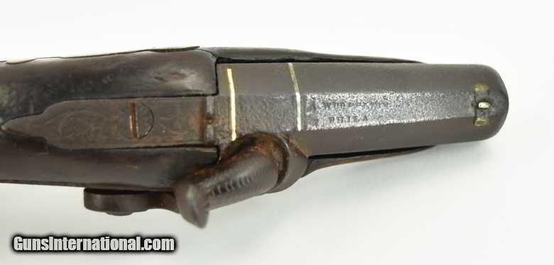 Description: Wurfflein percussion Derringer made in Philadelphia marked “Wurfflein Phila” on barrel. Barrel is 2 ¼” long. Breech plug bands are silver and gold. Action works fine. Stock is good plus. Metal shows wear and fine pits. Reasonably priced Henry Deringer copy (Circa 1850) by one of Henry’s many competitors. SOLD Antique: Yes |