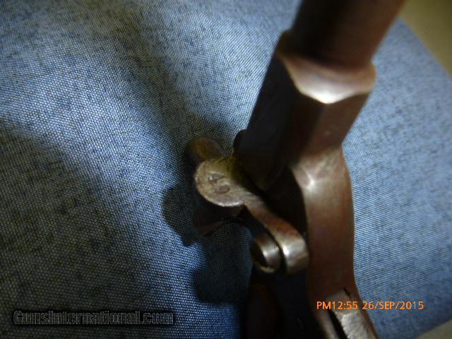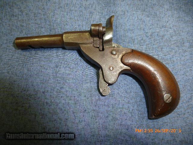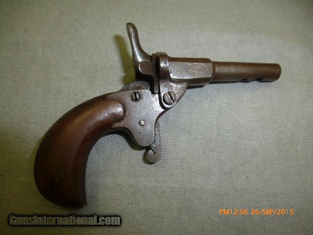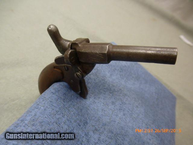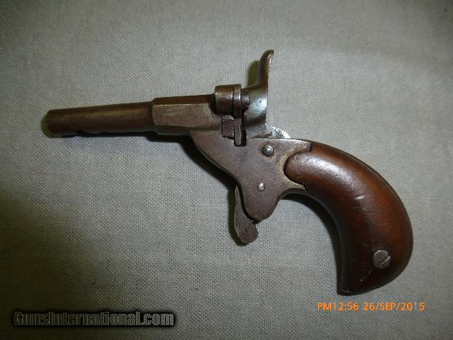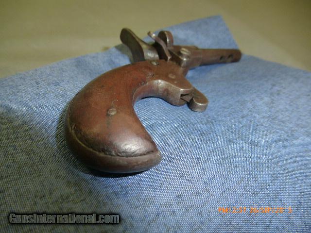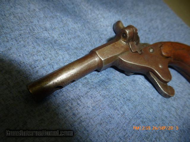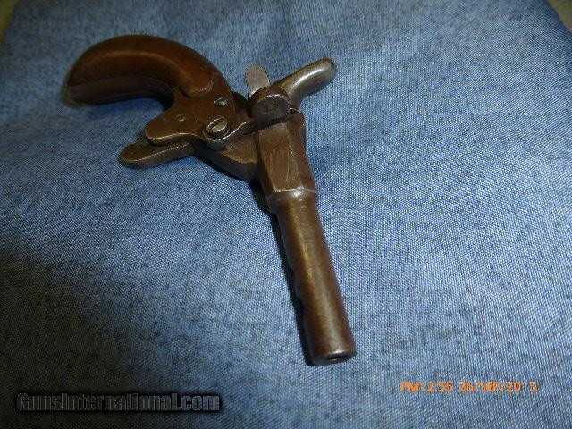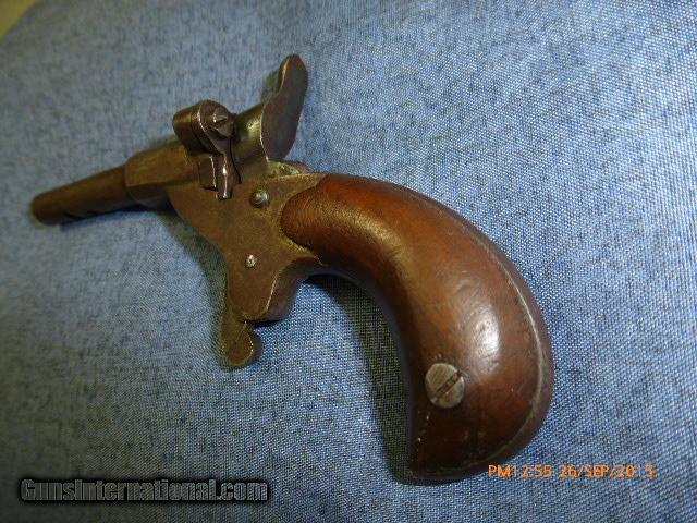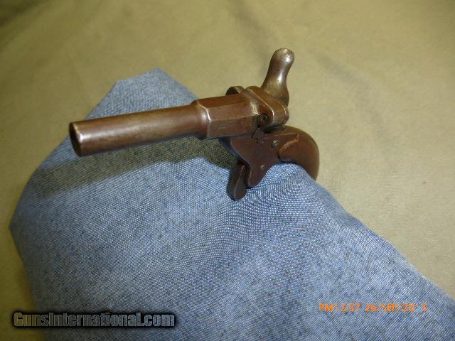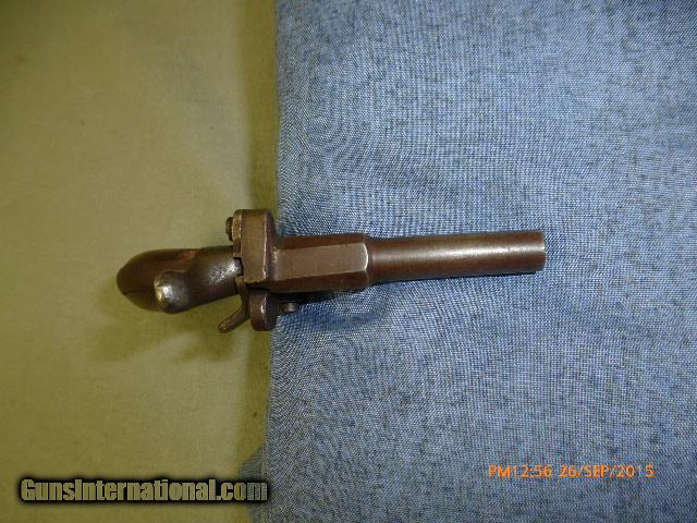Description: Single Shot Blank “Derringer” 15-88 Elaborate Single Shot Blank “Derringer” no markings. Has an elaborate loading mechanism where hammer is cocked and breech mechanism flips up to load cartridge, maybe .17 caliber. Quantity unknown; likely few hundred; quite scarce. Nickname, with others of their type. “ Fourth of July pistol”. Iron frame made without trigger guard, 4” overall, barrel 2” works fine, fully functional (15-88) $125.00 I take Visa/Mastercard, add 3%. Allow two weeks for all checks, whether bank, personal or certified to clear. It is also possible to wire funds to my account for instant credit for a $20.00 wire charge. 3 day- no questions asked return period for refund of price paid for gun. Call or email with any questions or for more pictures. Guns are antique and should not be fired without examination by gunsmith. $40 shipping for long guns, $30 for hand guns to lower 48 states, about $50 to most European countries and $70 to Australia for antique handguns. We can generally get insurance if you want through shipper but coverage is limited. Notify me if you want it. You can send 20% down- balance in 90 days for installment payment plan. No refunds on installment plans. I have shipped to Norway (long gun w/fragile stock) see feedback, England (Winchester1876, Rem Dbl. Derr.), Northern Ireland, France, Australia and Sweden. Email if you are not U.S. for estimated shipping costs, payment methods, etc. I am always buying and trading for antique and collectible guns, Indian items, rare ammo, etc. Email what you have got for sale or trade. SOLD |