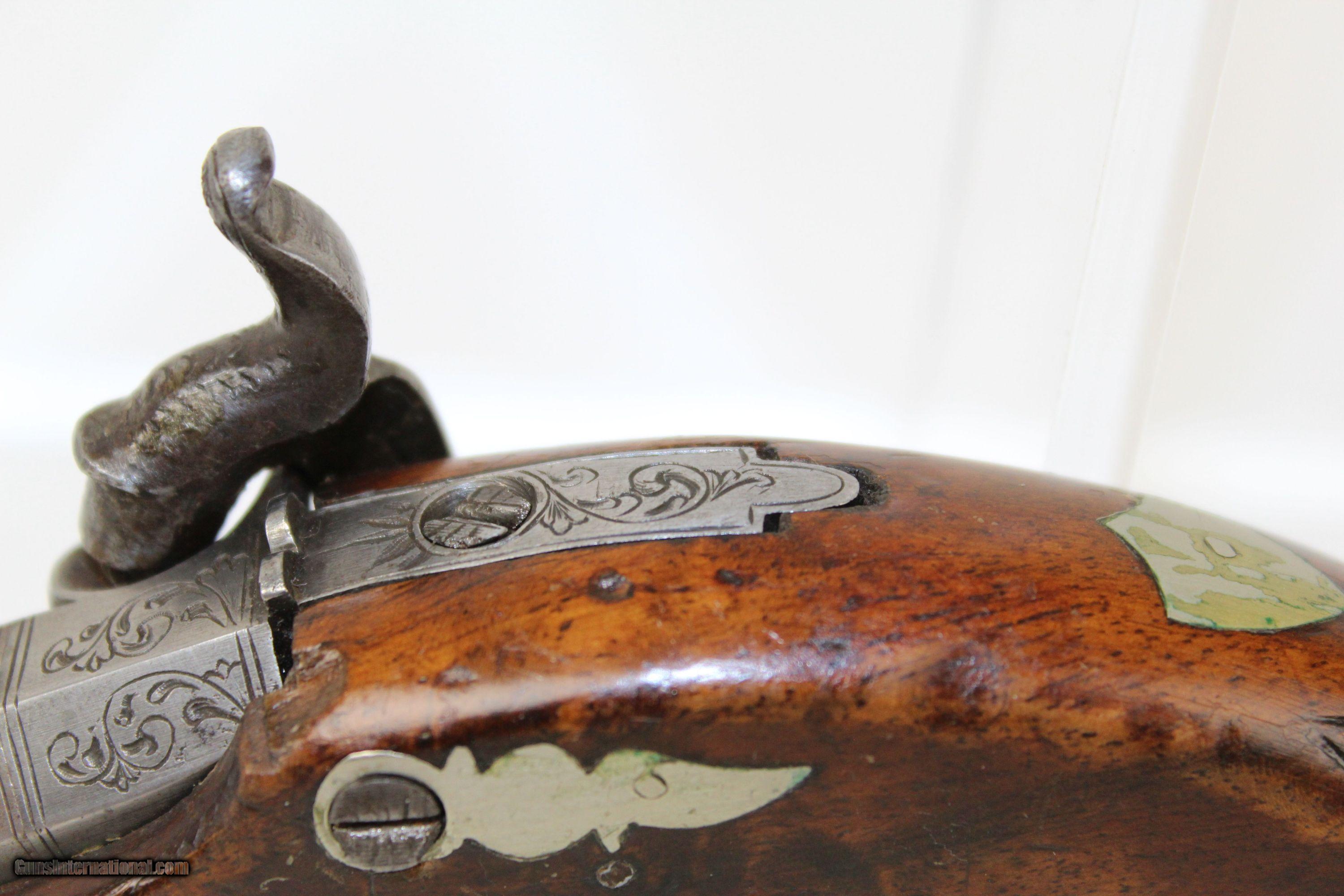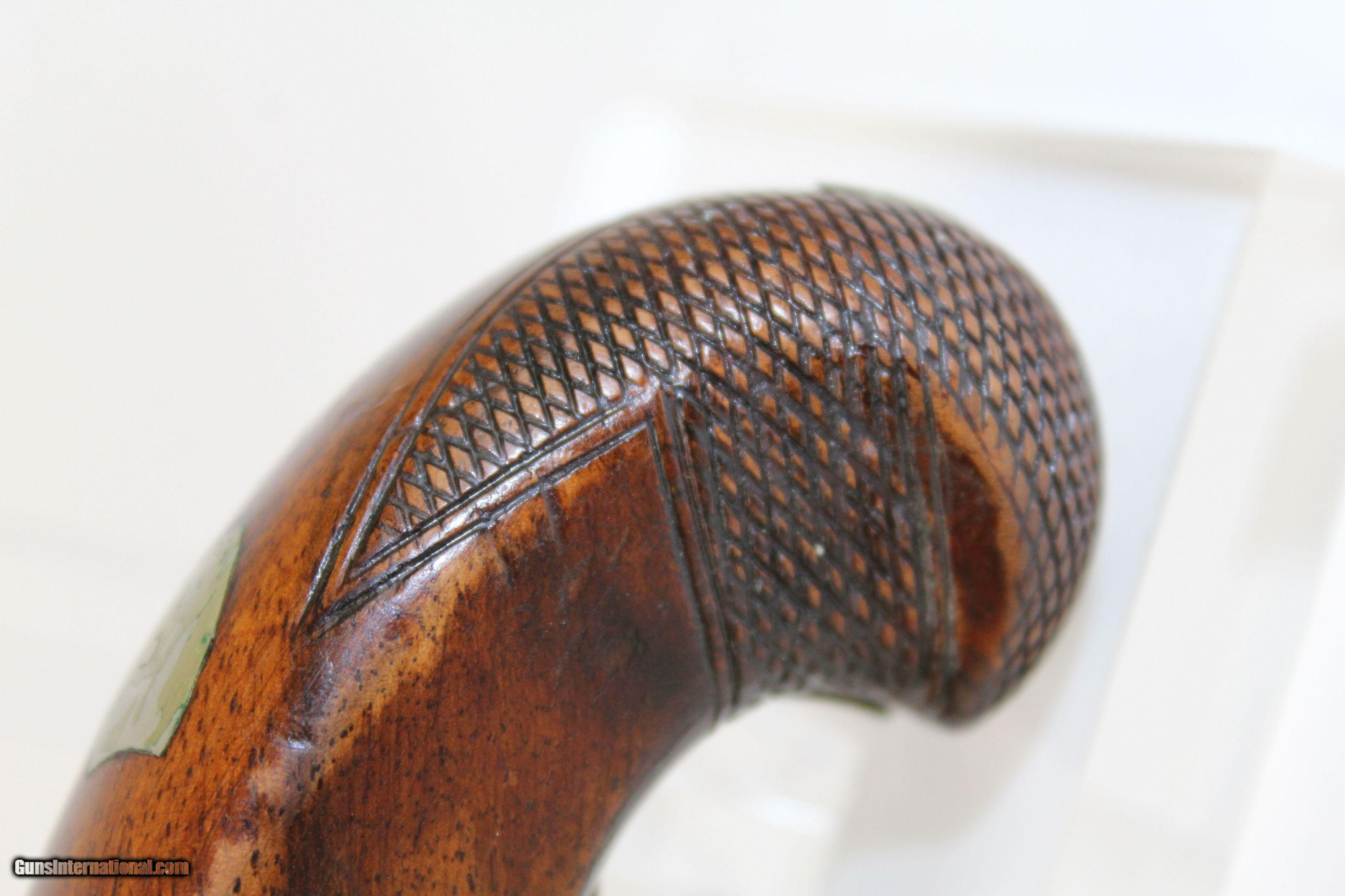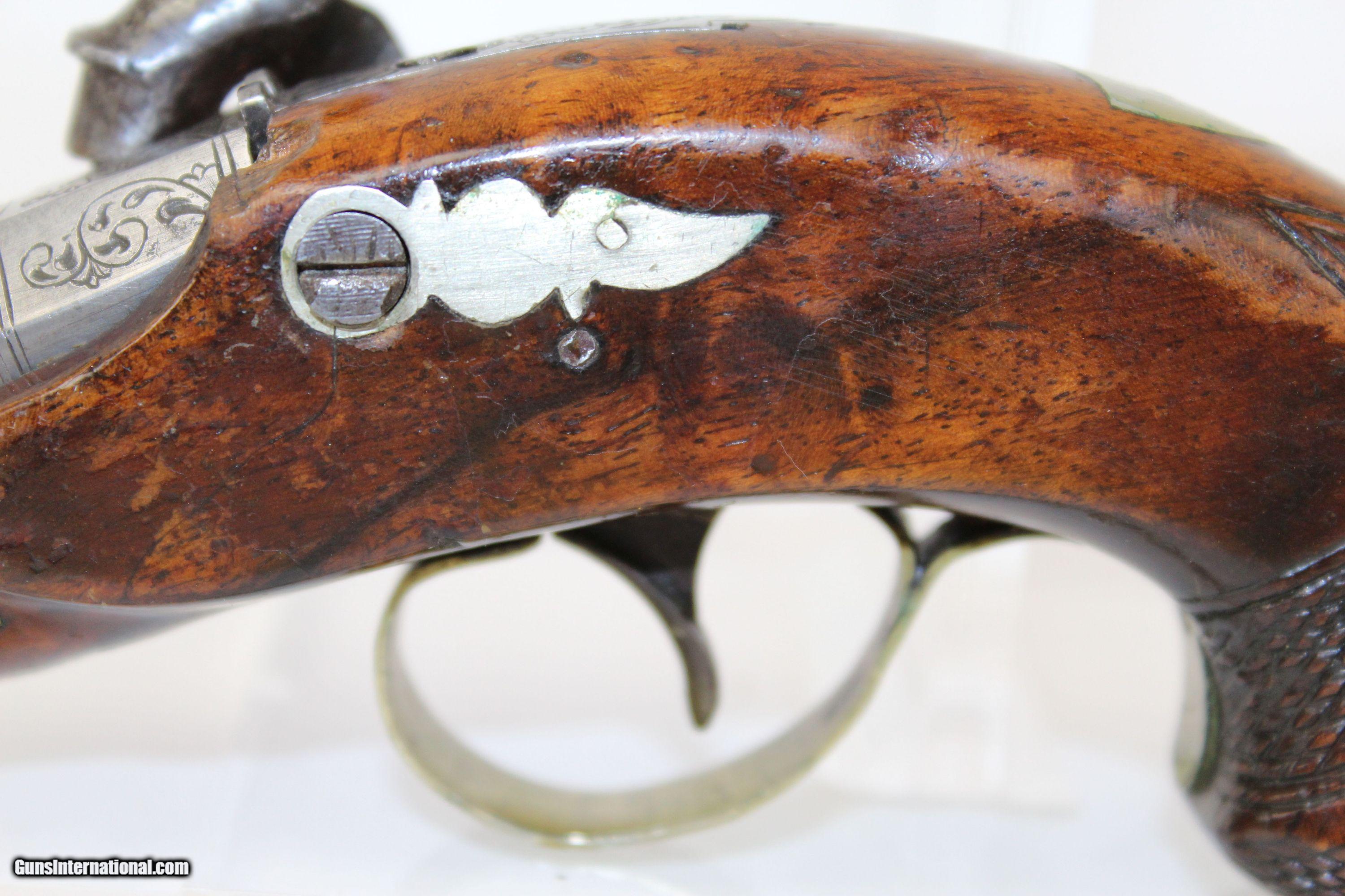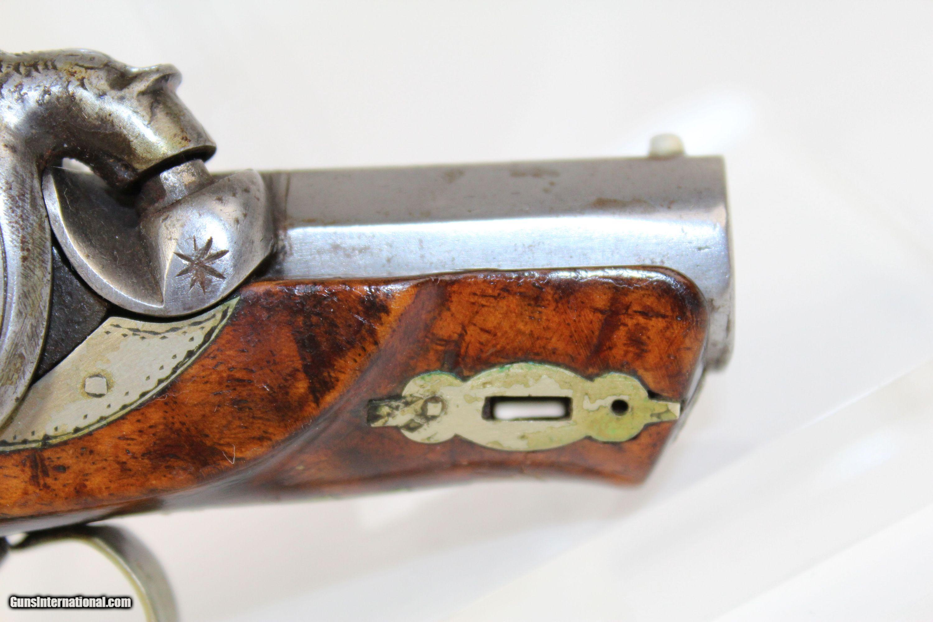 Description: 1850s ANTIQUE Percussion DERINGER Pistol Copy of Henry Deringer’s Famous Pocket Gun Here we present an antique Deringer Percussion Pistol, made circa 1850. Henry Deringer was a very successful Pennsylvanian gunsmith who started his own company in his early twenties, circa 1809. It was not until the 1850s that his prototypical “Deringer” percussion pistol became extremely popular. Once it did become popular, the basic design was copied in dozens of different shops. Not only was it copied, but Deringer’s good name was stamped on guns made by others, some of them not up to the quality standards of Deringer himself. The inventor was apparently very worried about protecting his good name, so he pursued and sued any of the counterfeiters that he could find and warned the buying public to beware of his spurious imitators. This piece is an example of one made by a competitor of Henry Deringer’s. It is not marked by any maker, though it is engraved. The overall condition is good. The metal surfaces are smooth. The engraving is clear. The walnut stock shows use and has been repaired near the muzzle. Barrel wedge is absent. The bore is dark with strong rifling. The action is excellent. Own the original! This is a legitimate antique and not a reproduction. Barrel is 1-1/8 inches. Caliber: .38 Percussion Overall condition as seen in photos. Very Fast. Very Safe. FREE SHIPPING WORLDWIDE. Delivered directly to your door by express mail! Guaranteed AUTHENTIC & Includes CERTIFICATE OF AUTHENTICITY. ancestryguns $850 #5205 SOLD Antique: Yes |