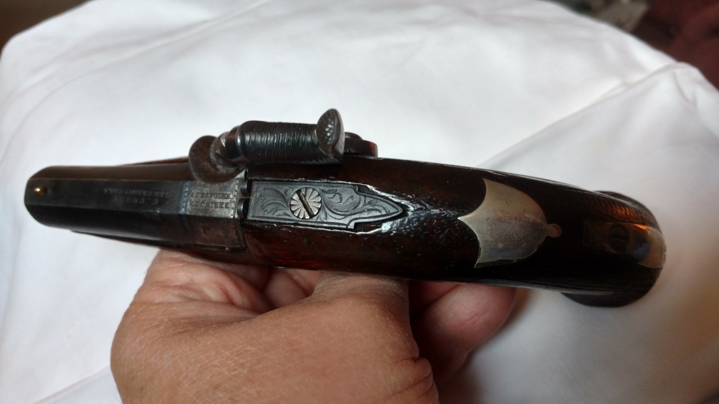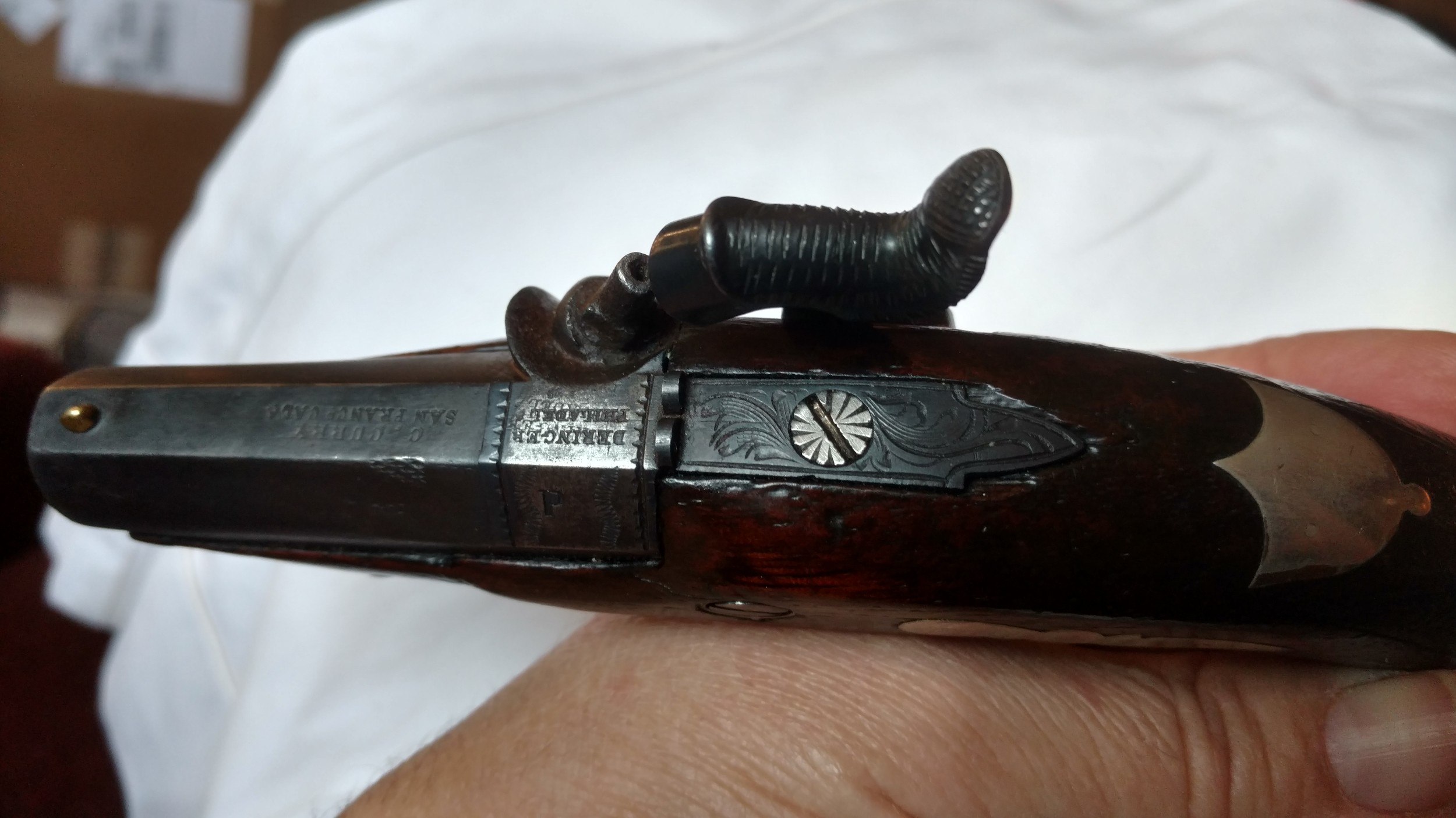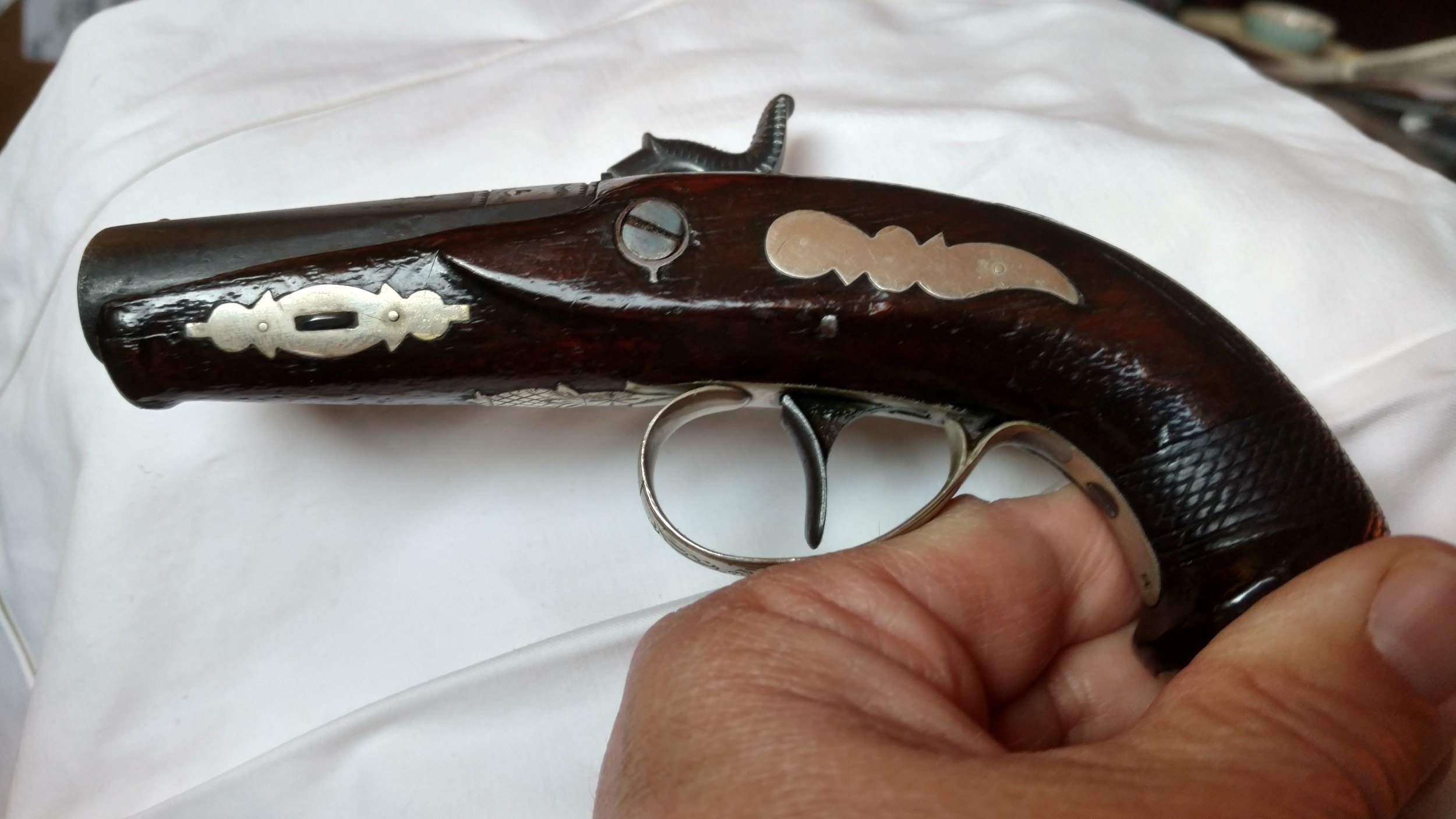 Description: C. CURRY San Francisco Cal. Philadelphia Derringer 41 cal. Muzzleloader percussion cap pistol 2inch barrel 6 1/4 inch in length Walnut stock 1852-1863 Engraved on the action has a letter D on the action Engraved on breachplug has the letter P on the left side Engraved on the cap area and other areas. VERY GOOD CONDITION Christmas in July SPECIAL SOLD Antique: Yes |