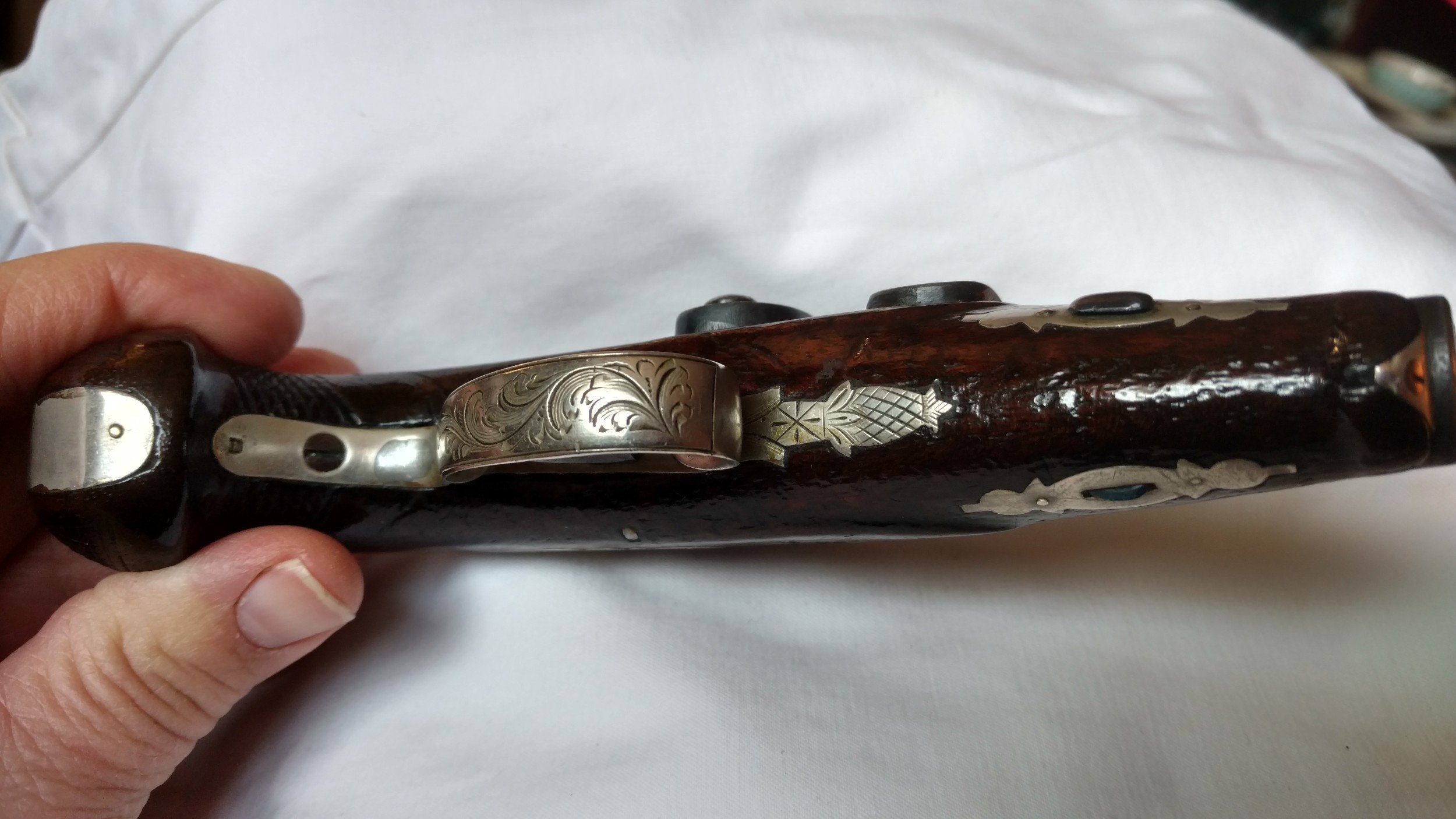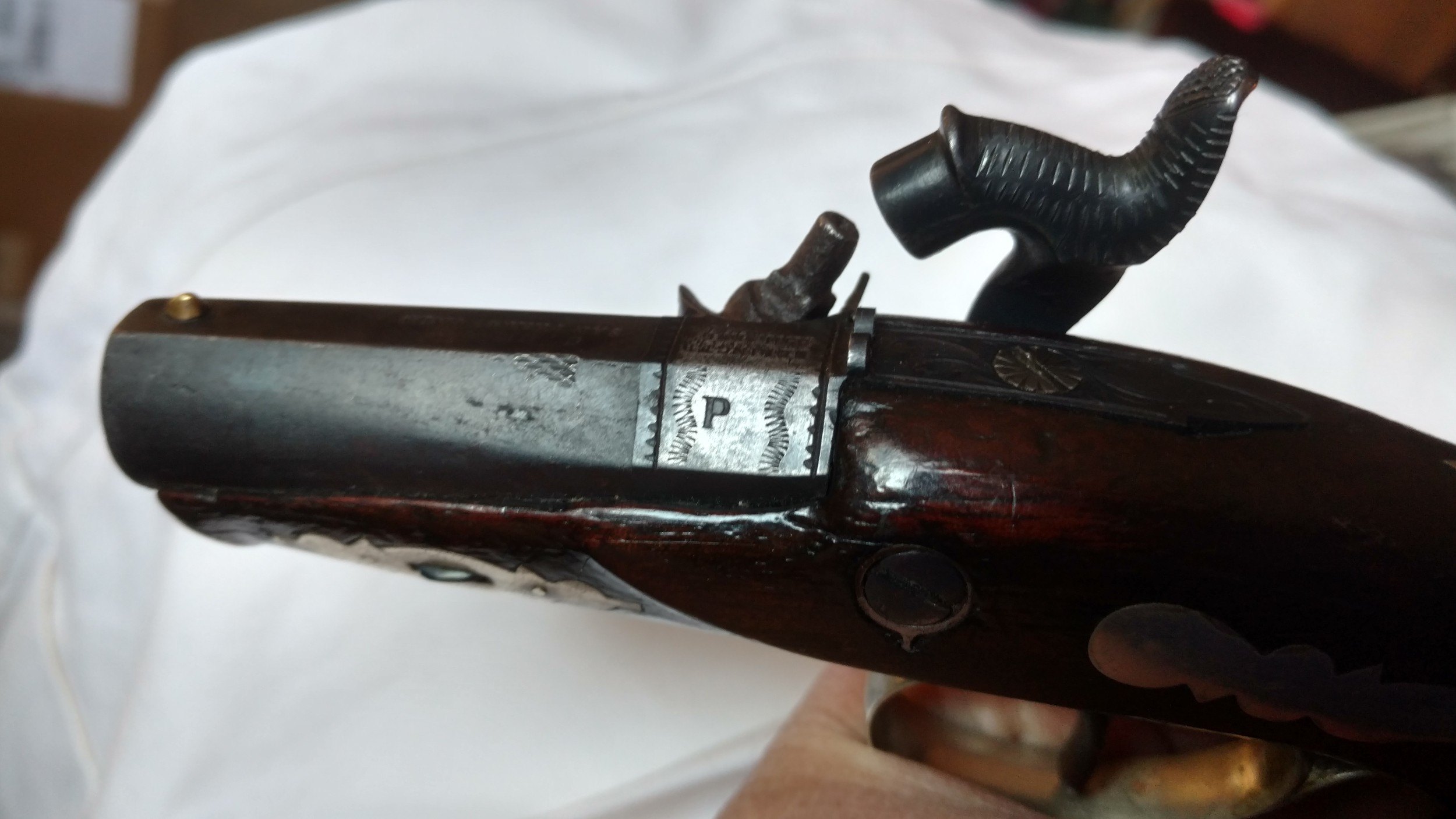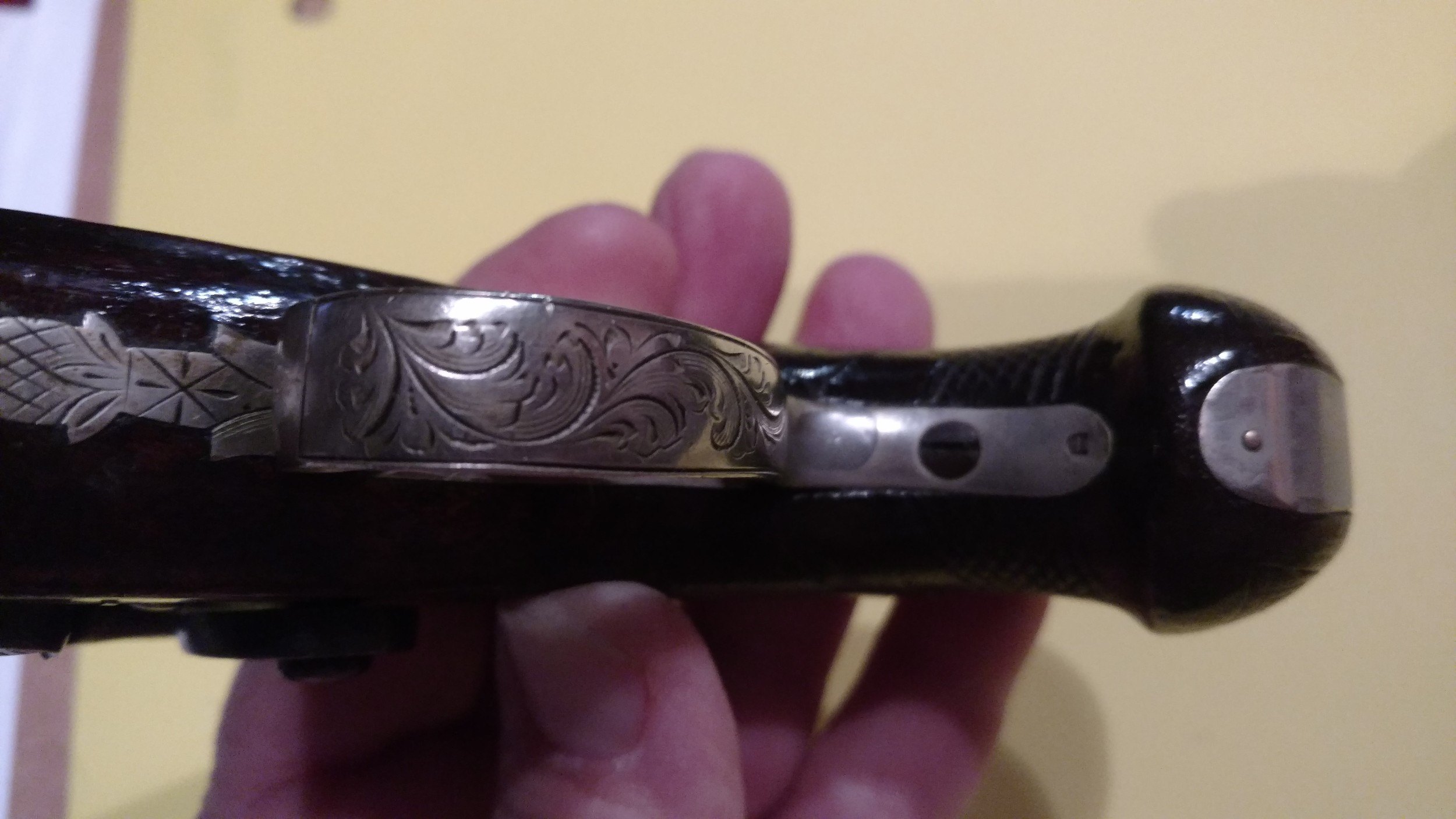 Description: C. CURRY San Francisco Cal. Philadelphia Derringer 41 cal. Muzzleloader percussion cap pistol 2inch barrel 6 1/4 inch in length Walnut stock 1852-1863 Engraved on the action has a letter D on the action Engraved on breachplug has the letter P on the left side Engraved on the cap area and other areas. VERY GOOD CONDITION Christmas in July SPECIAL SOLD Antique: Yes |