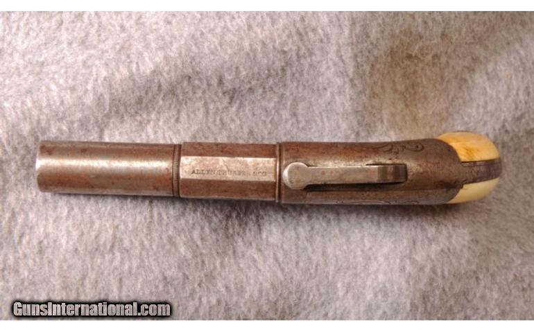 Description: Last type; arched grip;1845 patent type action. SOLD Antique: Yes Manufacturer: 1830's to Civil War era Metal Condition: No finish; mottled appearance Bore Condition: Dark; good rifling Barrels: 3 inch half round barrel Triggers: Double action bar Stock: Smooth ivory; age coloring and cracks Weight: 11 ozs Sights: None Item Location: Fort Worth, TX |