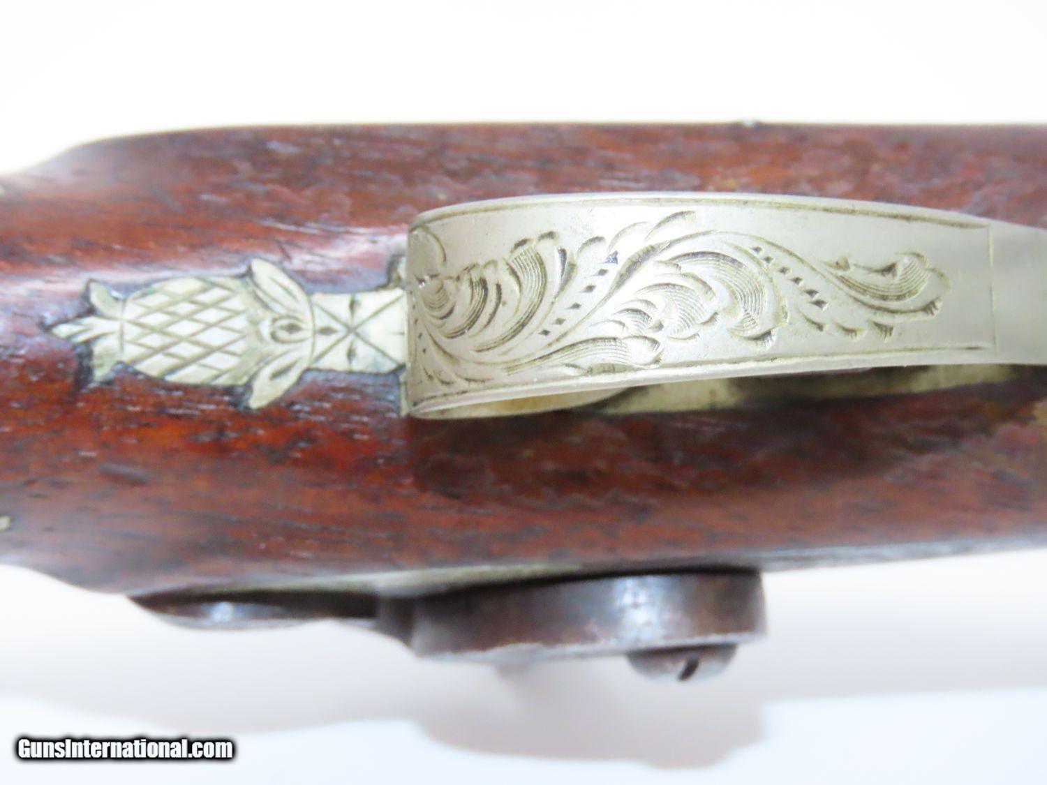 Description: Antique HENRY DERINGER Like the Pistol That Killed President Abraham Lincoln Henry Deringer’s Famous Pocket Pistol Here we present an antique Henry Deringer Percussion Pistol, made circa 1850s. Henry Deringer was a very successful Pennsylvanian gunsmith who started his own company in his early twenties, circa 1809. It was not until the 1850s that his prototypical “Deringer” percussion pistol became extremely popular. Once it did become popular, the basic design was copied in dozens of different shops. Not only was it copied, but Deringer’s good name was stamped on guns made by others, some of them not up to the quality standards of Deringer himself. The inventor was apparently very worried about protecting his good name, so he pursued and sued any of the counterfeiters that he could find and warned the buying public to beware of his spurious imitators. The name “Deringer” often invokes certain historical event, characters or moments in film. Deringer’s name has become both a noun and a catch-all term. President Abraham Lincoln was shot and killed with one of Henry Deringer’s pocket sized percussion pistols, the night John Wilkes Booth revenged the South at the Ford Theater. They conjure images of the California Gold Rush, as well as riverboat gamblers. These pistols were very practical for the time, being small and concealable and of large bore size. Here is what Charles Edwin Chapel had to say about the Deringer pistol: “For a man in a tight spot, with an armed enemy only a few feet away, a pair of single-shot Deringer pistols was more effective than the multi-shot pepperbox. You either got your man at the first or second shot—if, indeed, you were given the chance to fire twice—or you got a fast funeral. That heavy-calibered little gun was a man-stopper at short range, an effective surprise weapon, an “equalizer” with which many a gold-camp David permanently tamed the muscle-bulging, belligerent Goliaths of the frontier. Included in a man’s personal arsenal, the pistol was carried either as a principal weapon or as a reserve to be used when revolver, pepperbox or Bowie knife failed.” The overall condition is very good. The action is strong and tight. The bore is good. The metal parts are nicely engraved. Two silver bands are wrapped around the barrel at the breech. The stock is solid and is in great shape. The top of the barrel reads “DERINGER/PHILADEL”, as does the lock. Starburst “P” on the left side. Although small, this derringer will make a prodigious impact on the collection! Own the original! This is a legitimate antique and not a reproduction. Barrel is 1-7/8 inches Caliber: .41 Overall condition as seen in photos. Very Fast. Very Safe. FREE SHIPPING WORLDWIDE. Delivered directly to your door by express mail! Guaranteed AUTHENTIC & Includes CERTIFICATE OF AUTHENTICITY. ancestryguns $3345 #20789 SOLD Antique: Yes |