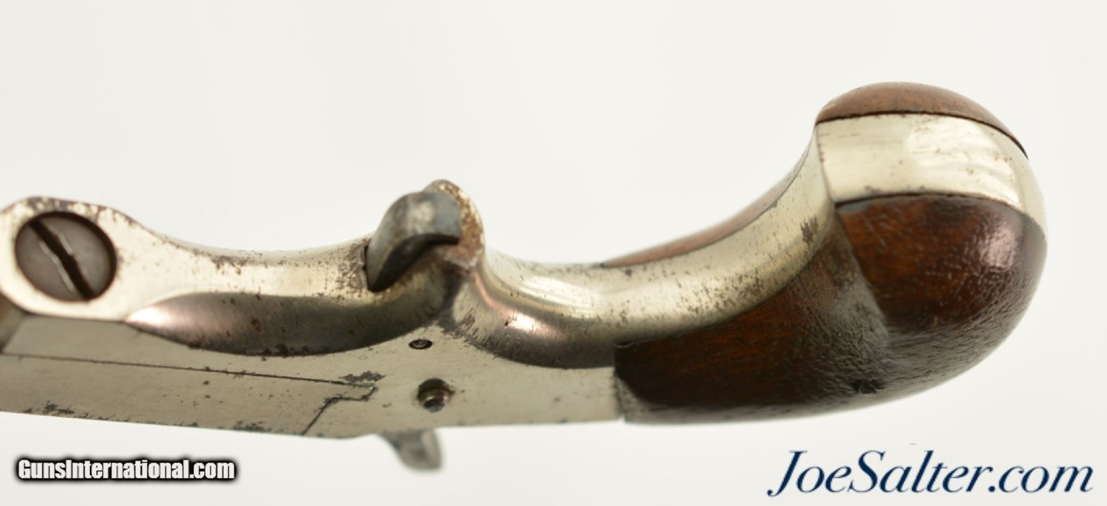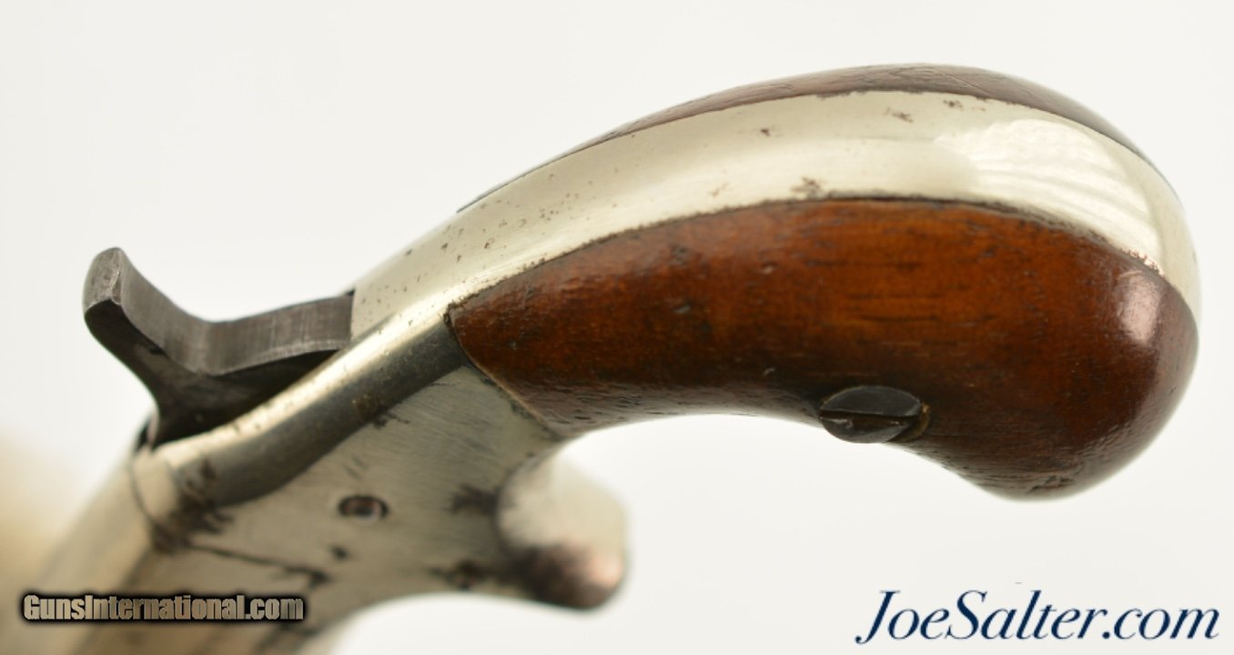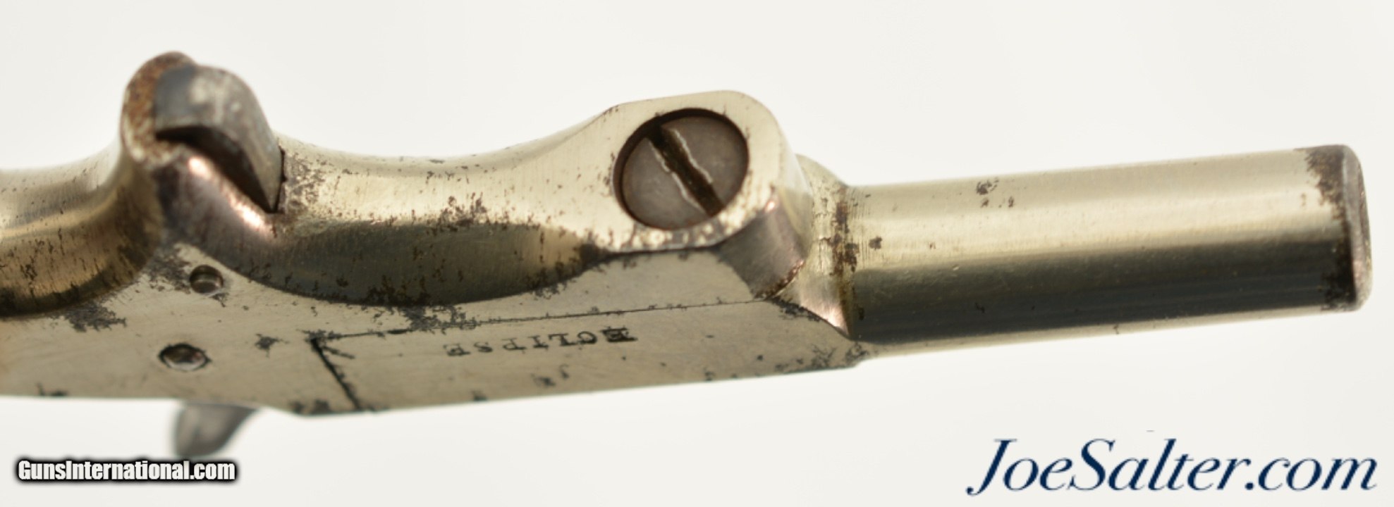 Description: Serial #3176, .22 RF, 2 ½ inch barrel with a partially rough bore. This the Eclipse model Derringer manufactured by Iver Johnson from 1871-1899. The metal surfaces on this diminutive hideout derringer retain about 85-90% original nickel finish, the flaked areas a plum brown showing light pitting on some of those areas, the left side of the barrel prominently marked "Eclipse". The bird's head shaped walnut grips both rate very good with some trace original varnish and very light wear. The spur trigger gun functions properly mechanically, barrel swings out to the side and has a tight lock up. With total quantity unknown this is an excellent surviving specimen. Antique; SOLD |