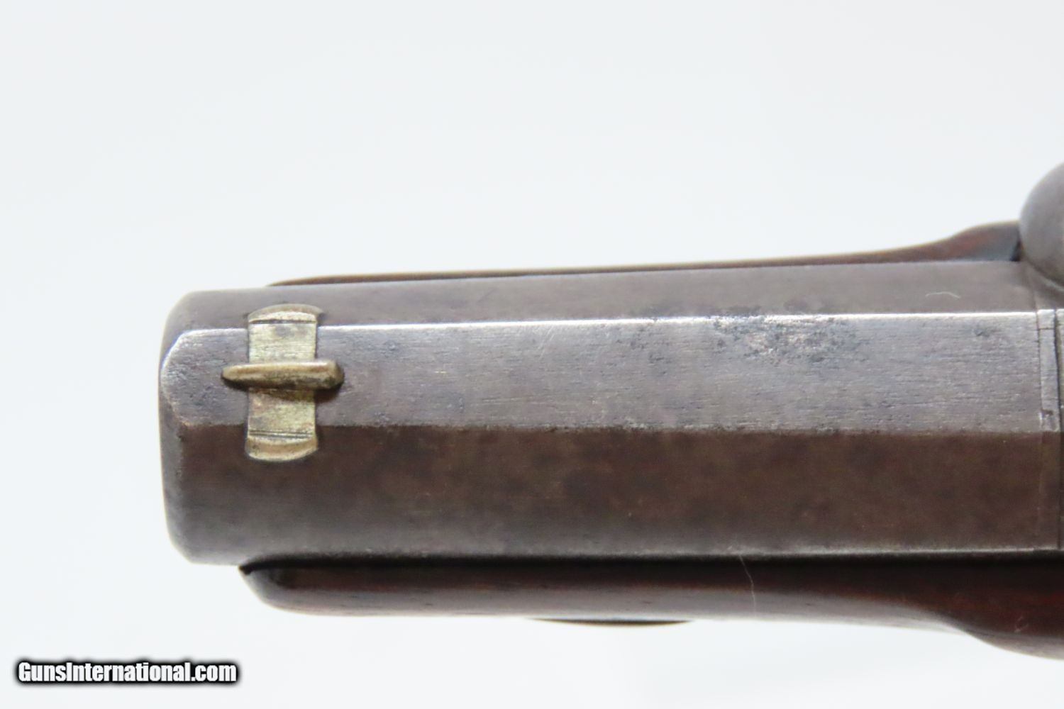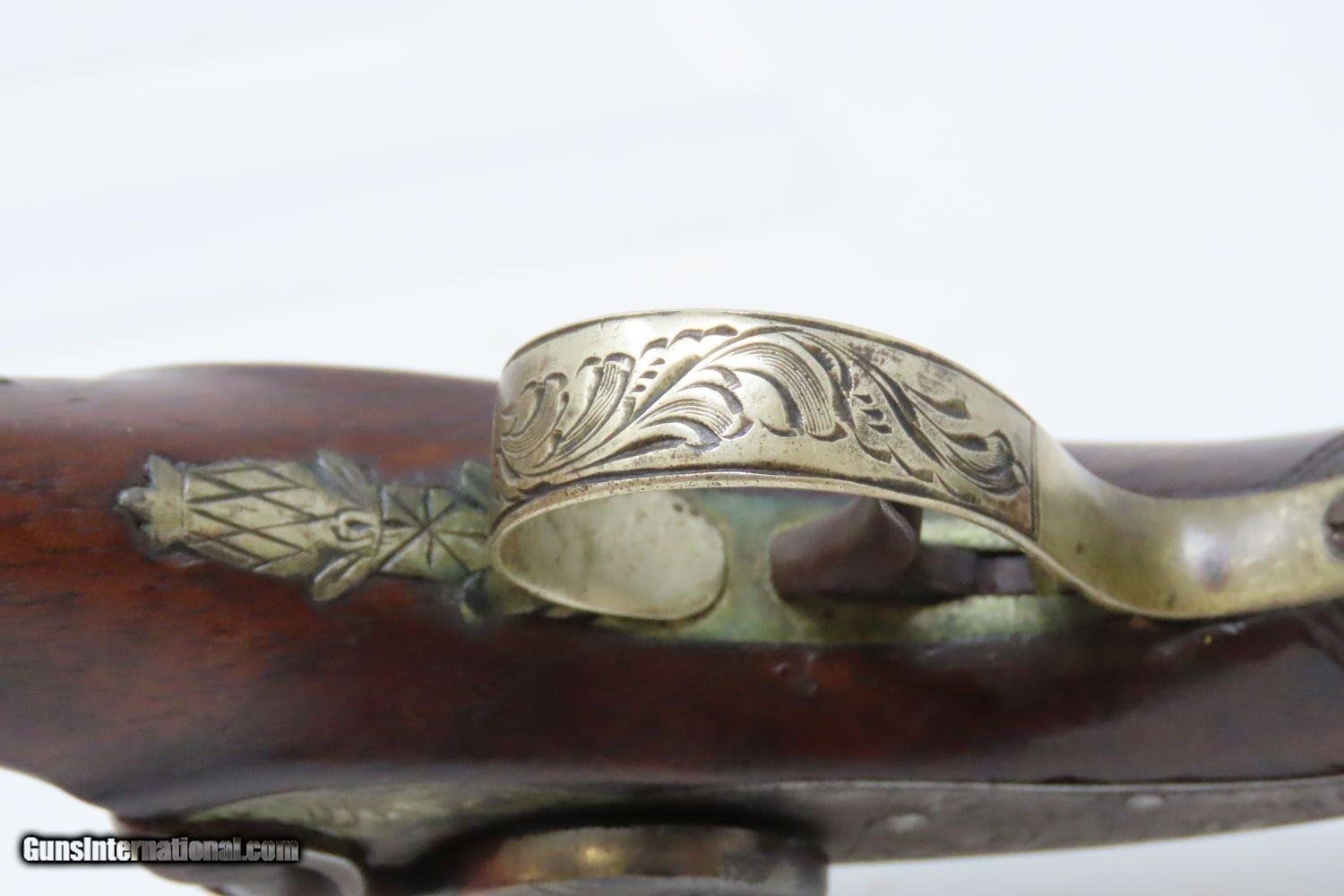 Description: Antique PHILADELPHIA DERINGER Percussion Pistol ENGRAVED Pocket 1850s ENGRAVED Self Defense Pistol with German Silver Accents! Here we present an antique Philadelphia Style Deringer Type Percussion Pistol, made circa the 1850s. This single shot pistol would have fired a .38 caliber ball and was intended for self-defense. One could easily keep in a pocket (or one in each pocket for follow up). It is quite the attractive pistol, with its German silver accents and engraved hardware. The name “Deringer” often invokes certain historical event, characters or moments in film. Deringer’s name has become both a noun and a catch-all term. President Abraham Lincoln was shot and killed with one of Henry Deringer’s pocket sized percussion pistols, the night John Wilkes Booth revenged the South at the Ford Theater. They conjure images of the California Gold Rush, as well as riverboat gamblers. These pistols were very practical for the time, being small and concealable and a fairly large bore size. The overall condition is very good. Nice sharp rifling in the bore with a patina to match the exterior. The action is excellent and crisp. The walnut stock is nicely hand-checkered and solid. There is the requisite short hairline split at the side plate screw on the left side. Beautiful engraved German silver ornament. The hammer has been well-repaired at the shank. Own the original! This is a legitimate antique and not a reproduction. Barrel is 1-7/8 inches. Caliber: .38 Percussion Overall condition as seen in photos. Very Fast. Very Safe. FREE SHIPPING WORLDWIDE. Delivered directly to your door by express mail! Guaranteed AUTHENTIC & Includes CERTIFICATE OF AUTHENTICITY. ancestryguns $2185 #215492 SOLD Antique: Yes |