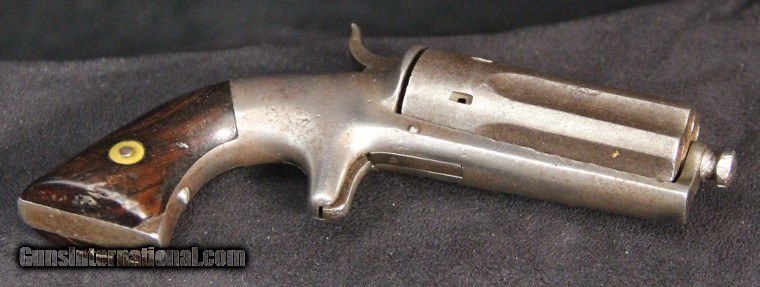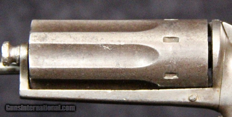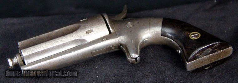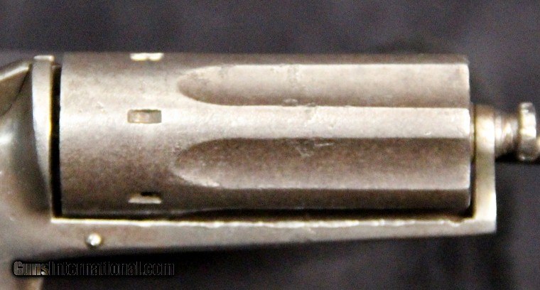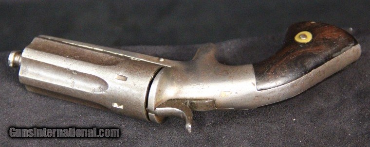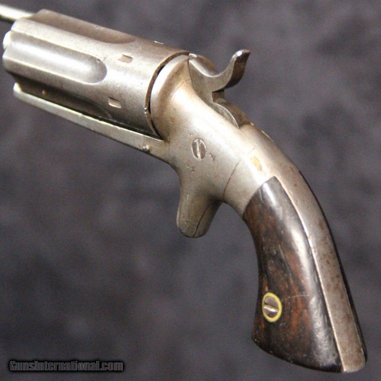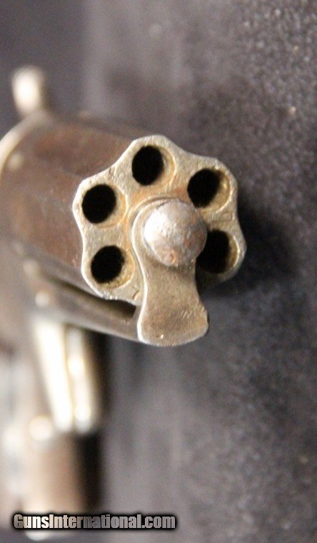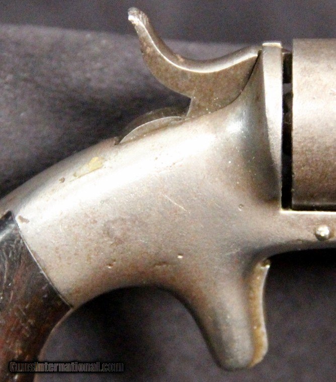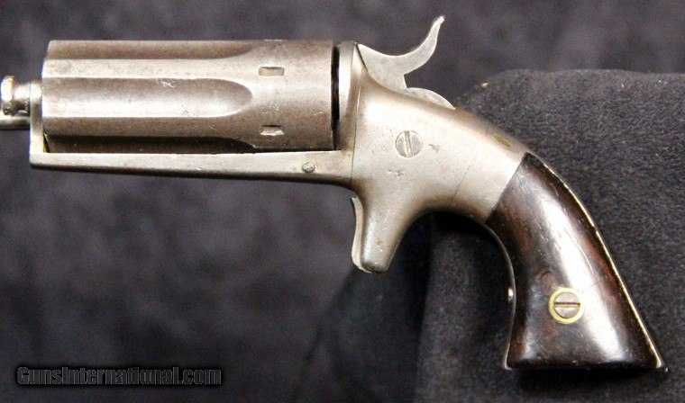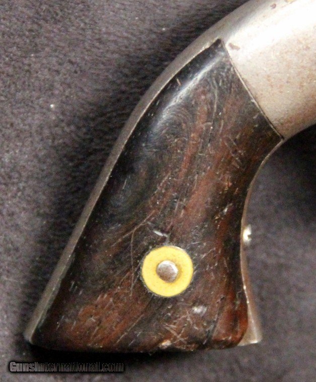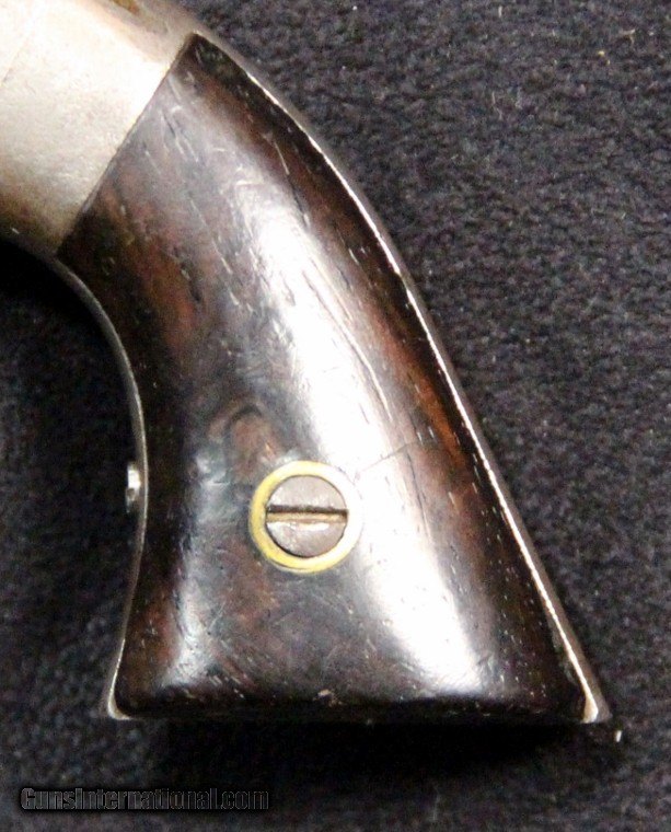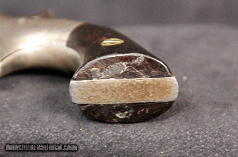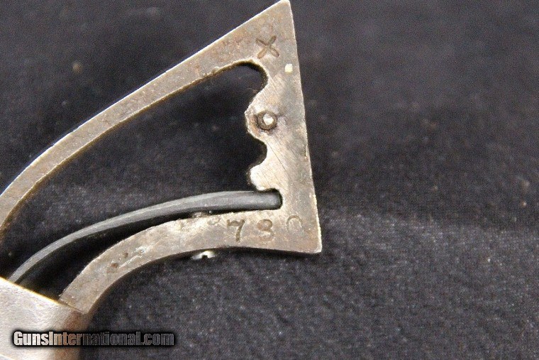 Description: .22rf, #780, 2 1/2 inch barrels, blue finish, 2 piece rosewood grips, 6 shot, late 1860's. Condition: dark bores, silver gary surfaces with traces of blue in flutes, very good grips, stiff mechanically, unmarked. SOLD Antique: Yes |