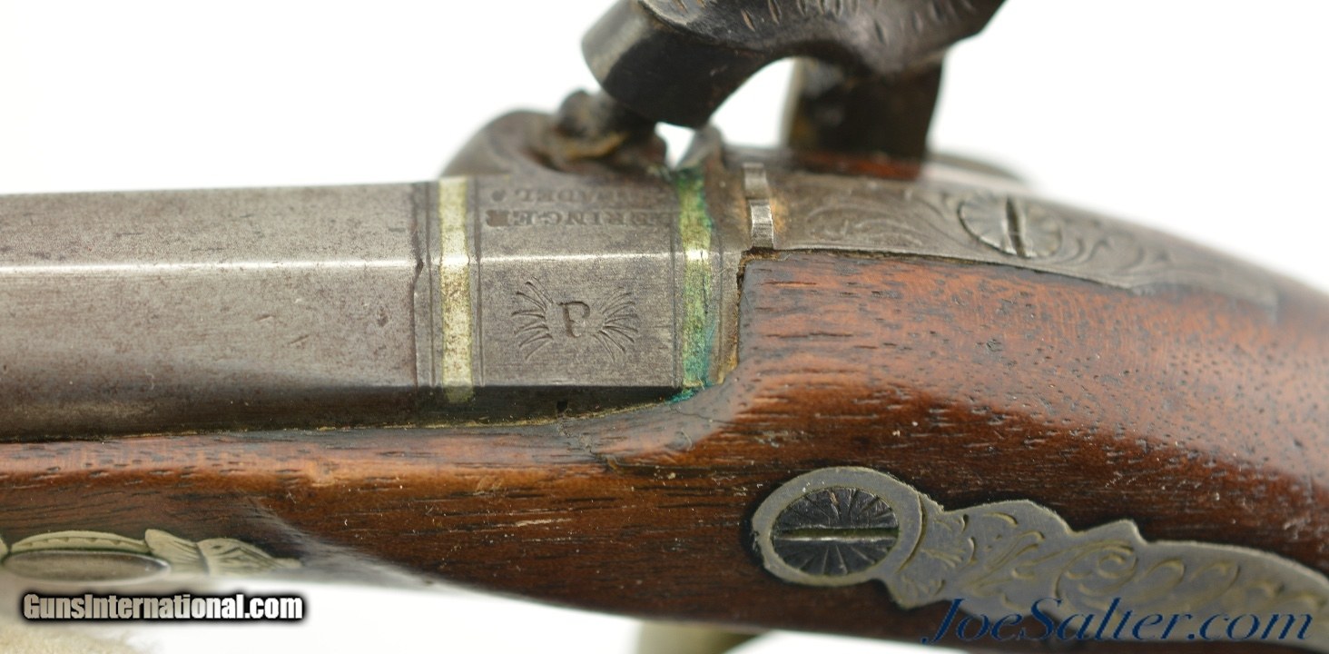 Description: This is an original Henry Deringer company small pocket size percussion pistol, about .41 caliber black powder percussion, with a 2 ½ inch, seven groove, rifled barrel having a very fine dark bore with strong rifling. The German silver round triggerguard finial details show this to be from circa 1848-1850 with the lockplate and barrel both marked "DERINGER / PHILADEL" with the "P" in starburst logo on the left barrel top facet and marked with "4" on grip side of the silver trigger guard. The overall length of this tiny pocket pistol is just shy of 6 inches making this example among the smaller ones produced and not fitted for a ramrod. In excellent condition the barrel retains about half of the original brown finish with the top faded to a very pleasing pewter-gray. The side plate, hammer and nipple have muted to a very pleasing dark pewter from the original case hardening color. The ornate silver furniture and embellishments have elegant engraved scroll work with very fine detail having a pleasing aged patina including the barrel inlay and front sight. The bird's head walnut stock is near excellent with some flattening of the checkering and scattered tiny use marks. Mechanically it functions properly cocking and firing with a crisp trigger pull. An excellent, beautiful example of this iconic Philadelphia built Deringer made infamous by John Wilkes Booth who used a similar weapon to assassinate President Lincoln. Antique SOLD Antique: Yes |